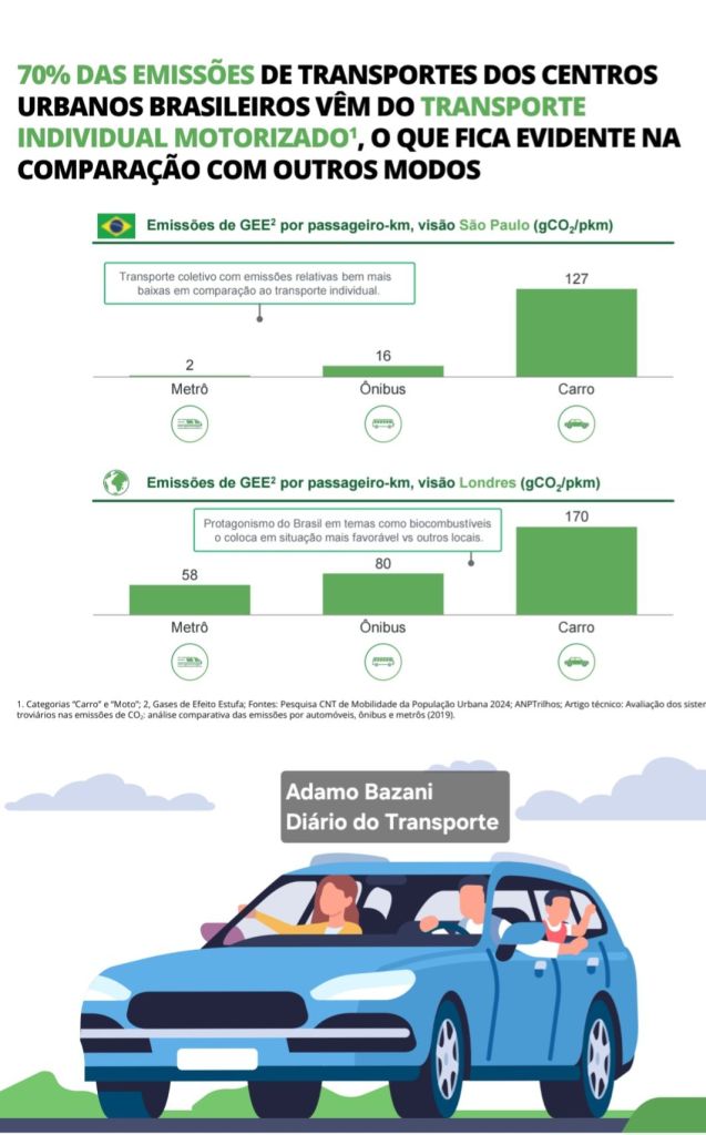 De acordo com estudo divulgado nesta terça-feira,  11 de novembro de 2025, pela Coalizão dos Transportes,  do Sistema Transporte, da CNT (Confederação Nacional do Transporte), em uma das atividades da Cop-30 (Conferência das Mudanças Climáticas da Organização das Nações Unidas), em média, 70% da poluição gerada nas cidades têm como origem o transporte individual.