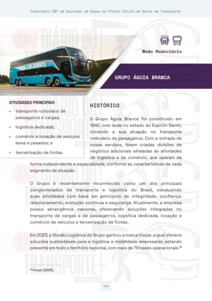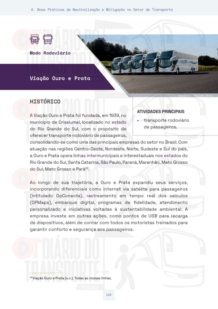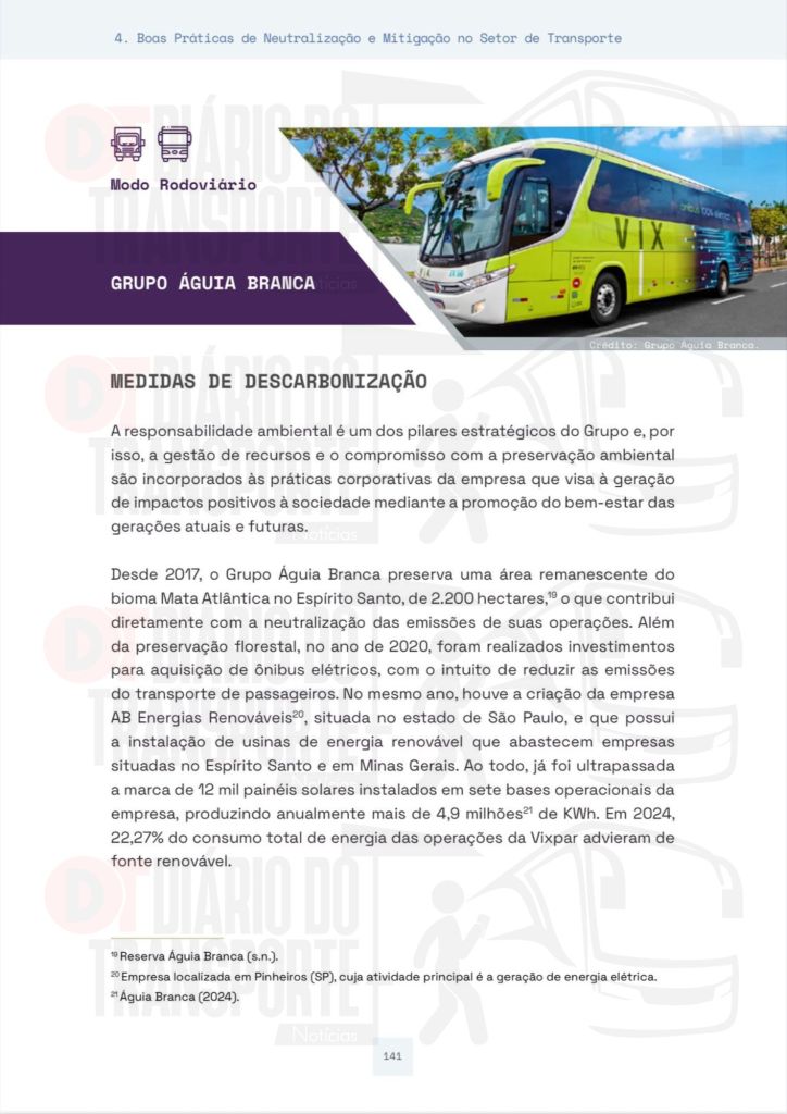 Entre os exemplos de boas práticas mencionados na publicação, na área de ônibus rodoviários de média e longa distância, estão a Viação Ouro e Prata, do Rio Grande do Sul, e o Grupo Águia Branca, que engloba, as empresas Viação Águia Branca e Vix Logística, com sede no Espírito Santo.