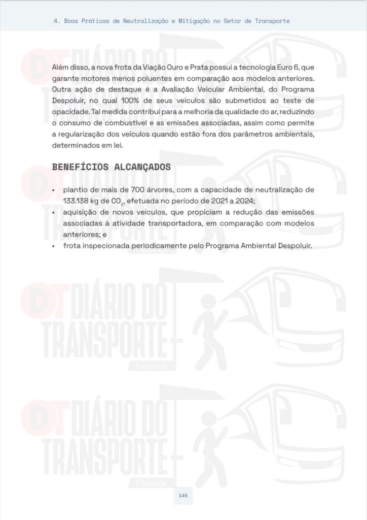 O compromisso com a sustentabilidade está presente na atuação da Viação Ouro e Prata, de modo que a empresa realiza investimentos em projetos que priorizam a responsabilidade visando a preservação do meio ambiente. Em 2021, no Dia da Árvore, todas as passagens vendidas no site oficial foram revertidas em plantio de árvores. A ação resultou em 438 mudas plantadas em uma área de preservação permanente em Gravataí (RS). Esse plantio proporcionou a compensação de 73 mil kg de CO2e e contemplou três dos Objetivos para o Desenvolvimento Sustentável da ONU24. Tais projetos foram importantes pois resultaram na compensação de 133.138 kg de CO2 com o plantio de 700 árvores25 no período de 2021 a 2024. Em 2022, a Ouro e Prata lançou o Programa Passagem Carbono Neutro, em que o usuário pode acessar o site oficial da empresa e solicitar a opção de compensação do seu trajeto. Todo o valor arrecadado é destinado a projetos certificados de proteção climática e ambiental, reconhecidos pela ONU e pelo VCS. Desde a sua implementação até setembro de 2025, a iniciativa Passagem Carbono Neutro neutralizou 60.138 kg de CO2, por meio do apoio a projetos relacionados ao plantio de árvores, que resultou em mais de 300 mudas plantadas.