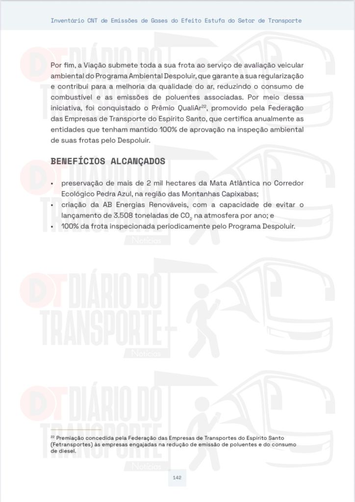 Por fim, a Viação submete toda a sua frota ao serviço de avaliação veicular ambiental do Programa Ambiental Despoluir, que garante a sua regularização e contribui para a melhoria da qualidade do ar, reduzindo o consumo de combustível e as emissões de poluentes associadas. Por meio dessa iniciativa, foi conquistado o Prêmio QualiAr22, promovido pela Federação das Empresas de Transporte do Espírito Santo, que certifica anualmente as entidades que tenham mantido 100% de aprovação na inspeção ambiental de suas frotas pelo Despoluir.