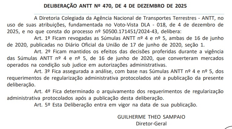 A ANTT publicou nesta sexta-feira (05/12) a Deliberação nº 470, ato que revoga as Súmulas nº 4 e nº 5, ambas de 2020, e encerra formalmente um dos capítulos mais sensíveis da regulação do transporte interestadual de passageiros nos últimos anos. Embora revogadas, os efeitos das decisões tomadas durante sua vigência permanecem válidos, garantindo estabilidade às empresas que regularizaram suas operações a partir dessas normas.
