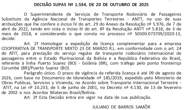 Decisão autoriza a Cooperativa 23 de Marzo R.L. a prestar serviço regular entre Bolívia e Brasil com tráfego pelo ponto fronteiriço de Corumbá (MS)
