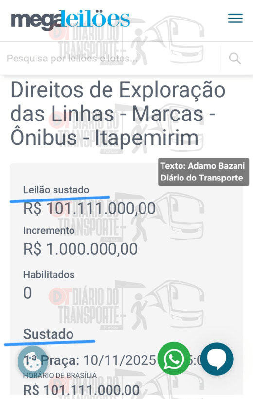 A leiloeira MegaLeilões, responsável por fazer as sessões para disputa entre possíveis empresas interessadas em assumir definitivamente 125 linhas de ônibus interestaduais, veículos usados, guichês e marcas do Grupo Itapemirim, que teve falência decretada em 21 de setembro de 2022, mudou o status da concorrência, que havia sido marcada para a partir de 10 de novembro de 2025, para Leilão Sustado.