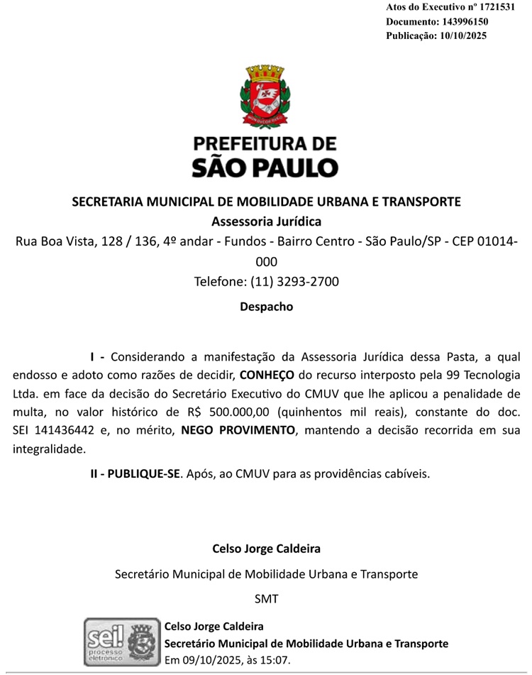 O despacho da Secretaria Municipal de Mobilidade Urbana e Transporte (SMT), assinado pelo secretário Celso Jorge Caldeira e referendado pelo prefeito Ricardo Nunes, confirma a decisão do CMUV. Segundo o documento, o secretário “conheceu o recurso interposto pela 99 Tecnologia Ltda., mas, no mérito, negou provimento, mantendo a decisão recorrida em sua integralidade”.