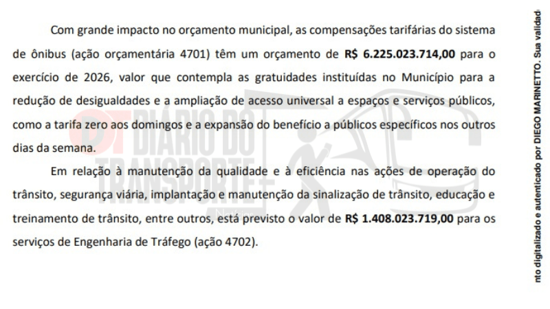 De acordo com o texto original da LOA (Lei Orçamentária Anual), as “compensações tarifárias do sistema de ônibus (ação orçamentária 4701) têm um orçamento de R$ 6,22 bilhões (R$ 6.225.023.714,00) para o exercício de 2026, valor que contempla as gratuidades instituídas no Município para a redução de desigualdades e a ampliação de acesso universal a espaços e serviços públicos, como a tarifa zero aos domingos e a expansão do benefício a públicos específicos nos outros dias da semana”.