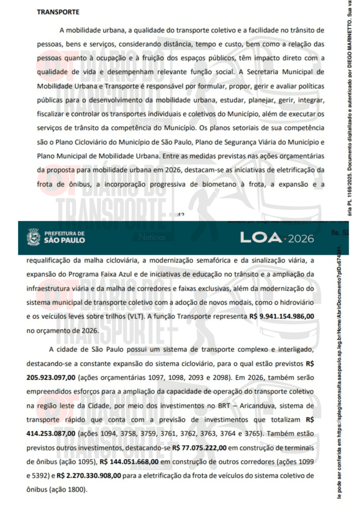 TRANSPORTE A mobilidade urbana, a qualidade do transporte coletivo e a facilidade no trânsito de pessoas, bens e serviços, considerando distância, tempo e custo, bem como a relação das pessoas quanto à ocupação e à fruição dos espaços públicos, têm impacto direto com a qualidade de vida e desempenham relevante função social. A Secretaria Municipal de Mobilidade Urbana e Transporte é responsável por formular, propor, gerir e avaliar políticas públicas para o desenvolvimento da mobilidade urbana, estudar, planejar, gerir, integrar, fiscalizar e controlar os transportes individuais e coletivos do Município, além de executar os serviços de trânsito da competência do Município. Os planos setoriais de sua competência são o Plano Cicloviário do Município de São Paulo, Plano de Segurança Viária do Município e Plano Municipal de Mobilidade Urbana. Entre as medidas previstas nas ações orçamentárias da proposta para mobilidade urbana em 2026, destacam-se as iniciativas de eletrificação da frota de ônibus, a incorporação progressiva de biometano à frota, a expansão e a requalificação da malha cicloviária, a modernização semafórica e da sinalização viária, a expansão do Programa Faixa Azul e de iniciativas de educação no trânsito e a ampliação da infraestrutura viária e da malha de corredores e faixas exclusivas, além da modernização do sistema municipal de transporte coletivo com a adoção de novos modais, como o hidroviário e os veículos leves sobre trilhos (VLT). A função Transporte representa R$ 9.941.154.986,00 no orçamento de 2026. A cidade de São Paulo possui um sistema de transporte complexo e interligado, destacando-se a constante expansão do sistema cicloviário, para o qual estão previstos R$ 205.923.097,00 (ações orçamentárias 1097, 1098, 2093 e 2098). Em 2026, também serão empreendidos esforços para a ampliação da capacidade de operação do transporte coletivo na região leste da Cidade, por meio dos investimentos no BRT – Aricanduva, sistema de transporte rápido que conta com a previsão de investimentos que totalizam R$ 414.253.087,00 (ações 1094, 3758, 3759, 3761, 3762, 3763, 3764 e 3765). Também estão previstos outros investimentos, destacando-se R$ 77.075.222,00 em construção de terminais de ônibus (ação 1095), R$ 144.051.668,00 em construção de outros corredores (ações 1099 e 5392) e R$ 2.270.330.908,00 para a eletrificação da frota de veículos do sistema coletivo de ônibus (ação 1800).