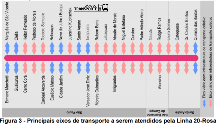 As estações da Linha 20-Rosa que estiverem próximas dos eixos de transporte acima deverão prever, em seus projetos, suficientes para a integração entre os modos, bem como as intervenções necessárias no viário (pedestres e leito carroçável) para o cumprimento das funcionalidades previstas para a linha. A Figura 3 apresenta os principais eixos de transporte a serem atendidos pela Linha 20-Rosa.