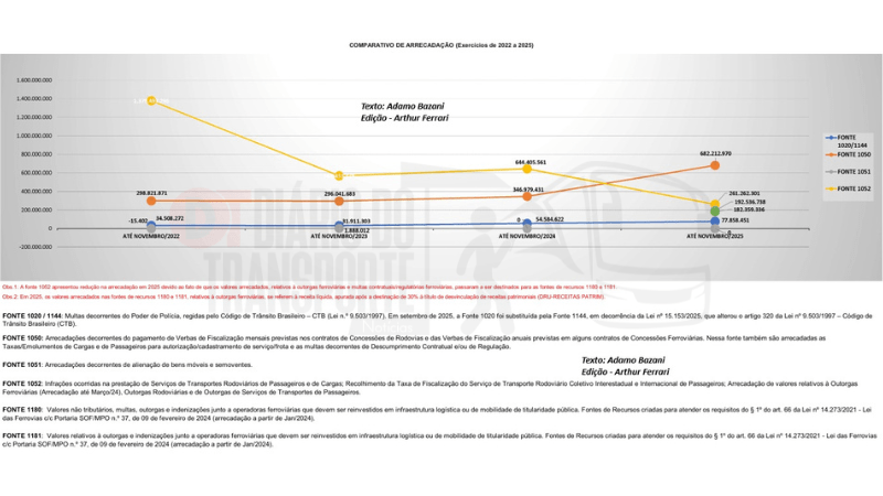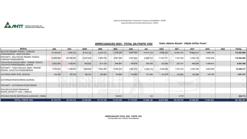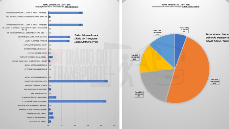 De acordo com levantamento ao qual o Diário do Transporte teve acesso, praticamente metade da arrecadação de 2025 — 49%, ou R$ 682,21 milhões (R$ 682.212.970) — teve origem nas concessões de rodovias e ferrovias. Esse montante inclui taxas de fiscalização, repasses e multas incidentes sobre operações de transporte de cargas e passageiros vinculadas ao tráfego nas estradas.
