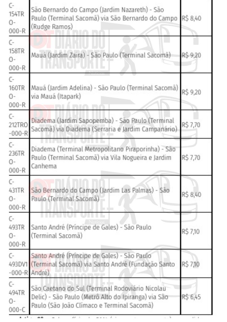 As passagens de ônibus intermunicipais do ABC que se integram com o Expresso Tiradentes no Terminal Sacomã também ficam mais caras a partir de 06 de janeiro de 2026 e ficam entre R$ 6,45; R$ 7,10; R$ 7,70; R$ 9,20 e R$ 9,40, dependendo da linha