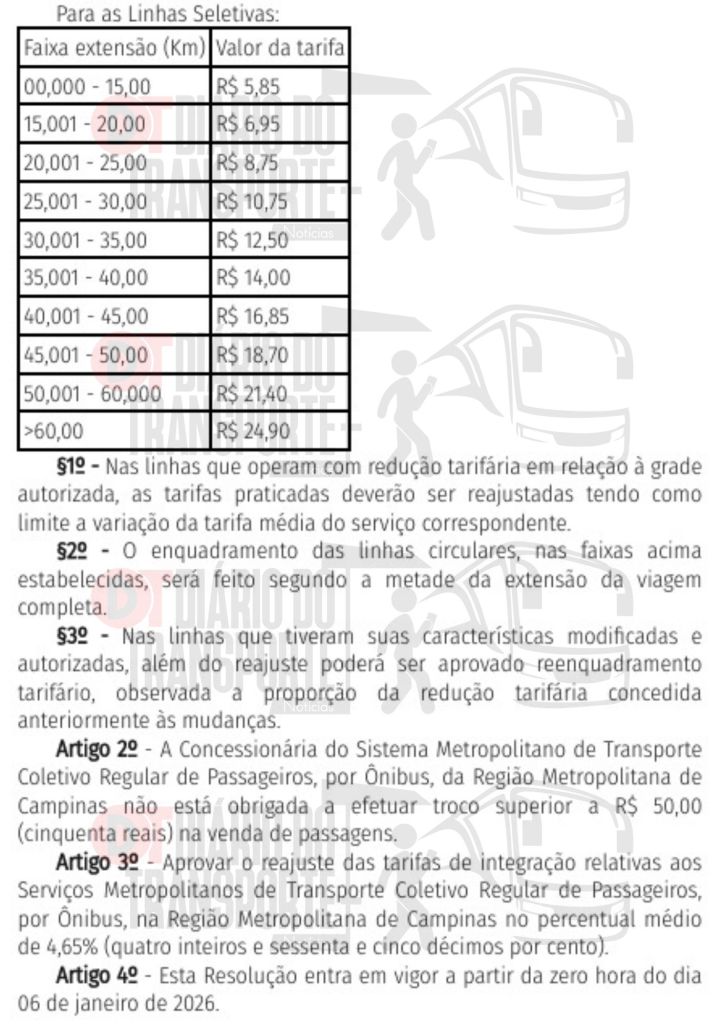 Na Região Metropolitana de Campinas, no interior de São Paulo, as tarifas de ônibus intermunicipais metropolitanos ficam, a partir de 06 de janeiro de 2026, entre R$ 5,85 e R$ 13,20 nas linhas comuns, e entre R$ 5,85 e R$ 24,90 nas linhas seletivas, dependendo da extensão dos trajetos.