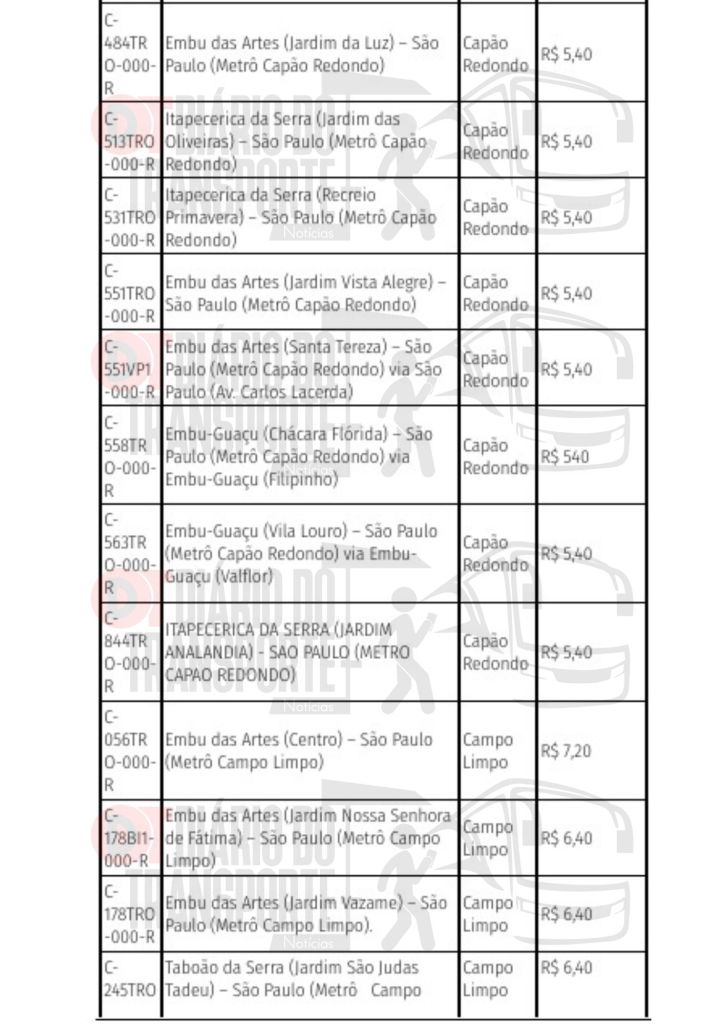 As linhas circulares intermunicipais que ligam as cidades de Cotia, Osasco, Itapevi e Jandira e as que vão para R$ 7,05; R$ 7,70; R$ 8,10 e R$ 8,75, dependendo do itinerário