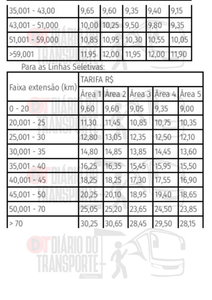 Já para as linhas seletivas (ônibus com características de rodoviários), os valores variam entre R$ 7,90 e R$ 34,40.