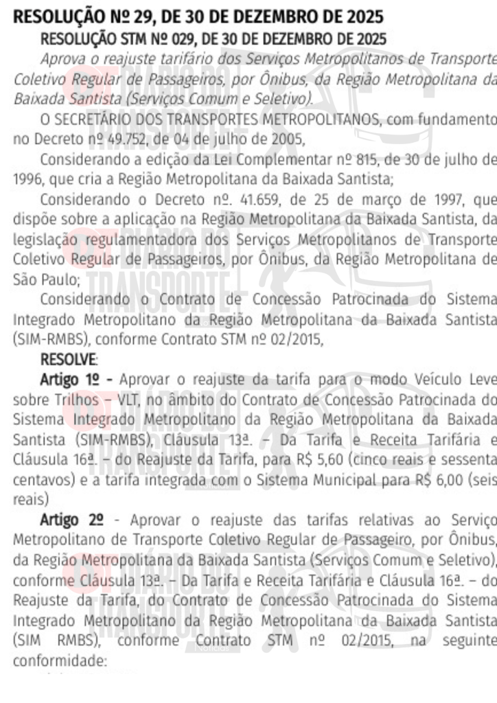 A tarifa do VLT (Veículo Leve sobre Trilhos) vai para R$ 5,60 e a tarifa integrada do VLT com o Sistema Municipal de Ônibus de Santos para R$ 6,00.