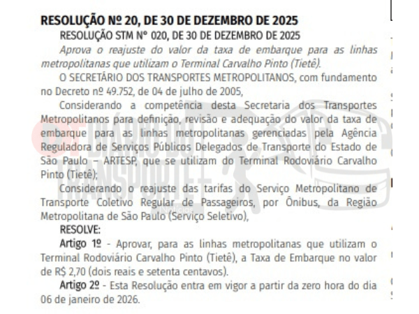Embarcar nos ônibus intermunicipais metropolitanos gerenciados pela Artesp no Terminal Rodoviário Tietê, na zona Norte da capital paulista, também fica mais caro a partir de terça-feira, 06 de janeiro de 2026.