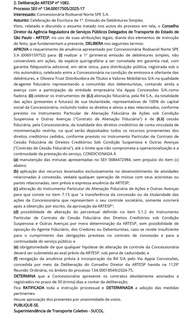 A Deliberação nº 1082 da ARTESP aprovou a anuência para a 1ª emissão de debêntures simples, não conversíveis em ações, em série única e distribuição pública, registrada sob rito automático. A Oliveira Trust Distribuidora de Títulos e Valores Mobiliários S.A. atuará como agente fiduciário, representando os investidores. O grupo Via Appia participa da operação como fiador.