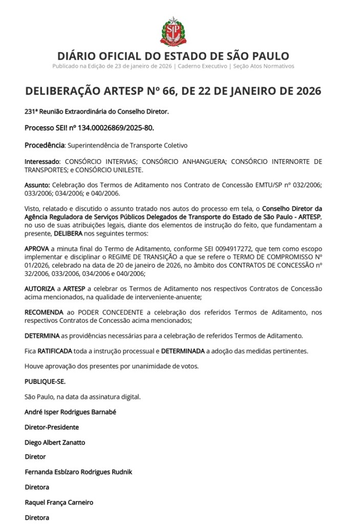 A ARTESP publicou no Diário Oficial do Estado desta sexta-feira, 23 de janeiro de 2026, a Deliberação ARTESP nº 66/2026, que formaliza a adoção de um Regime de Transição no transporte coletivo metropolitano de passageiros da Região Metropolitana de São Paulo.