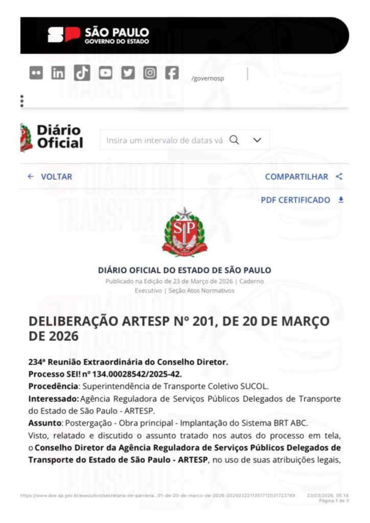 A Agência Reguladora de Serviços Públicos Delegados de Transporte do Estado de São Paulo (ARTESP) reconheceu a ocorrência de postergação nos investimentos das obras do BRT ABC, gerando desequilíbrio econômico-financeiro provisório em favor do Poder Concedente no valor atualizado de R$ 130,9 milhões.