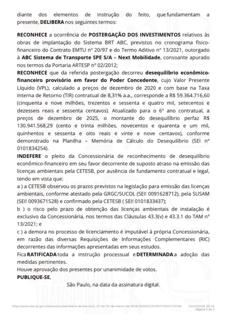 Segundo a ARTESP, a postergação está relacionada ao descumprimento do cronograma físico-financeiro previsto no Contrato EMTU nº 20/97 e no Termo Aditivo nº 13/2021, que rege a concessão operada pela ABC Sistema de Transporte SPE S/A – Next Mobilidade.