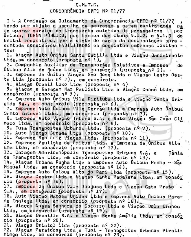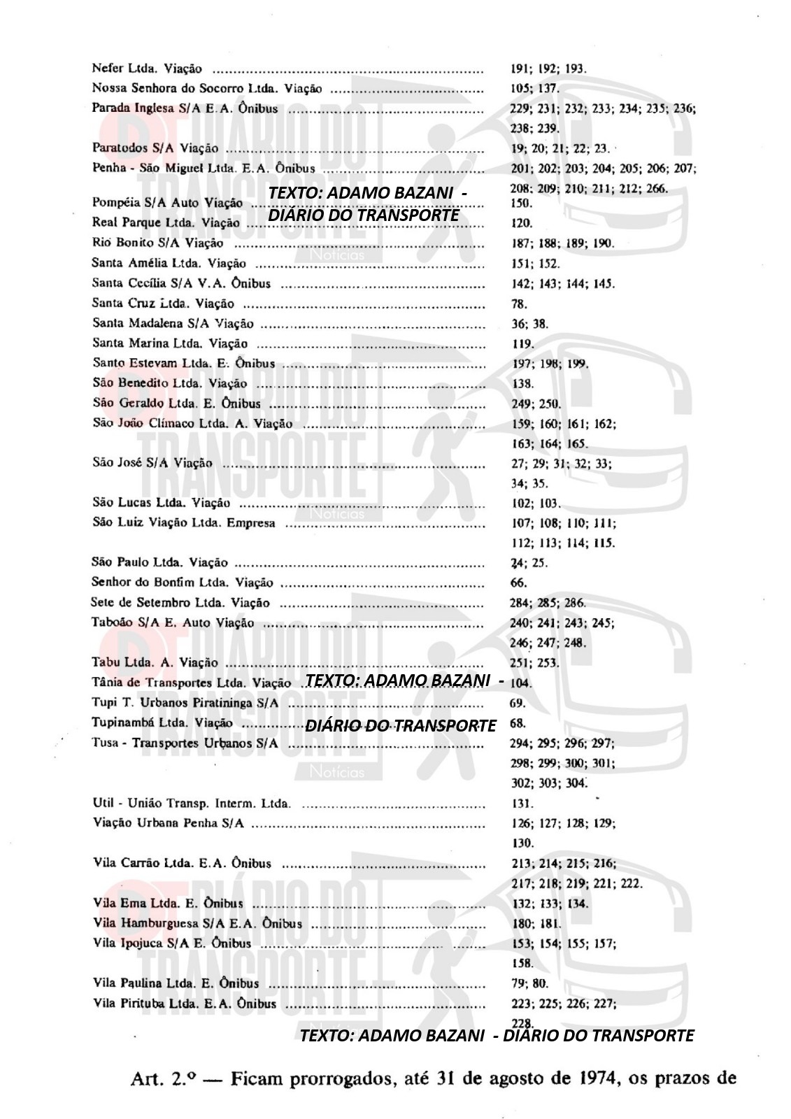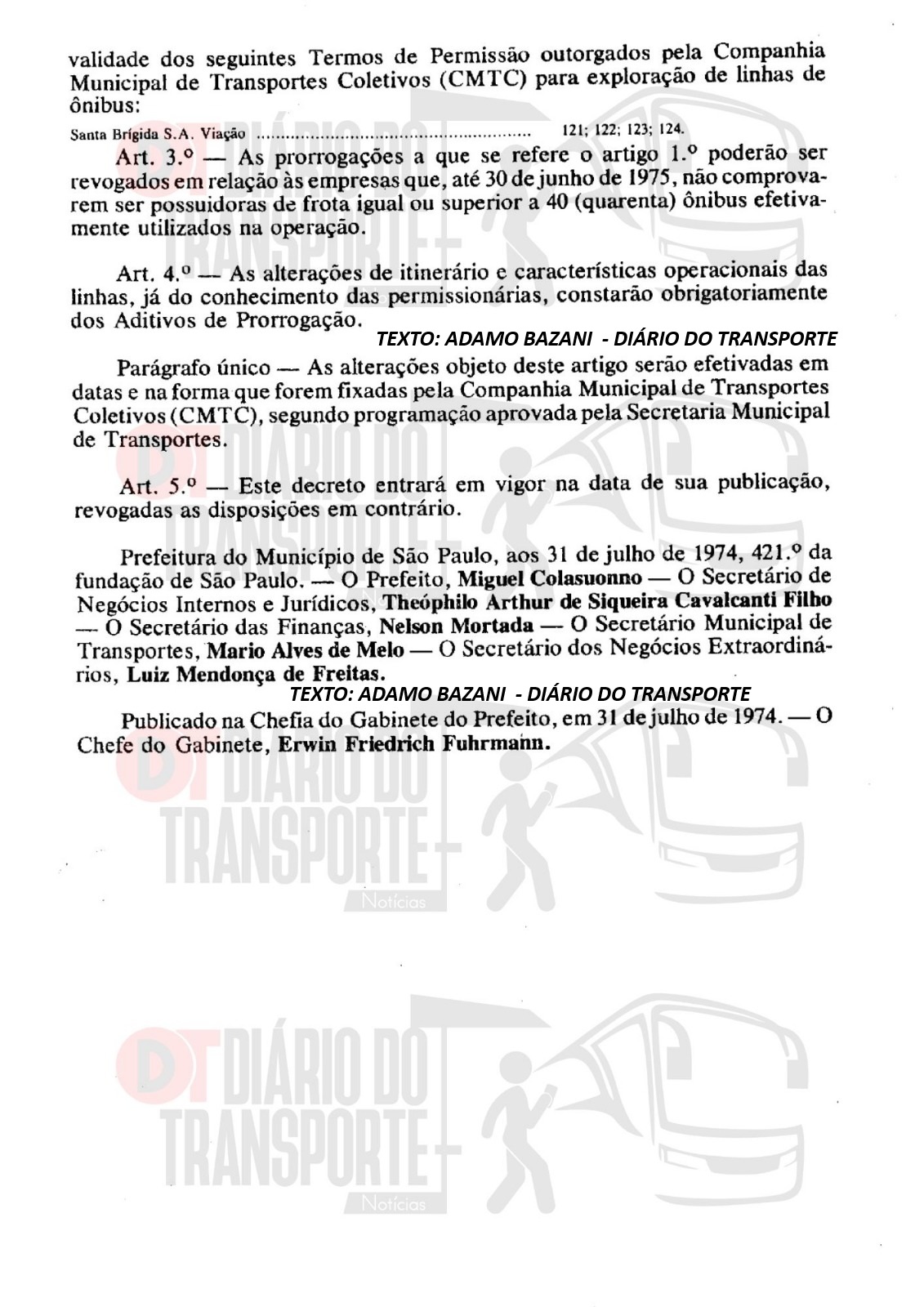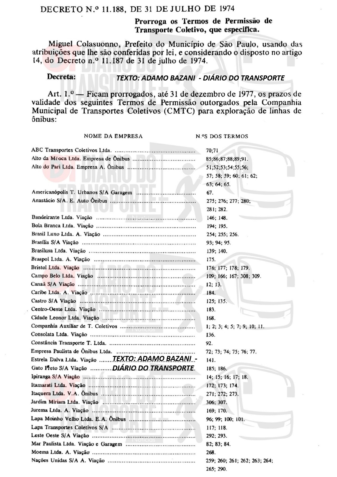 Neste dia 25 de janeiro de 2026, Aniversário de São Paulo, o Diário do Transporte traz um documento histórico, oficial, de 31 de julho de 1974, que se trata do decreto de prorrogação até 31 de dezembro de 1977, dos prazos de validade dos Termos de Permissão outorgados a viações privadas pela empresa da prefeitura Companhia Municipal de Transportes Coletivos (CMTC), que era operadora e gestora, рarа еxploração de linhas de ônibus.