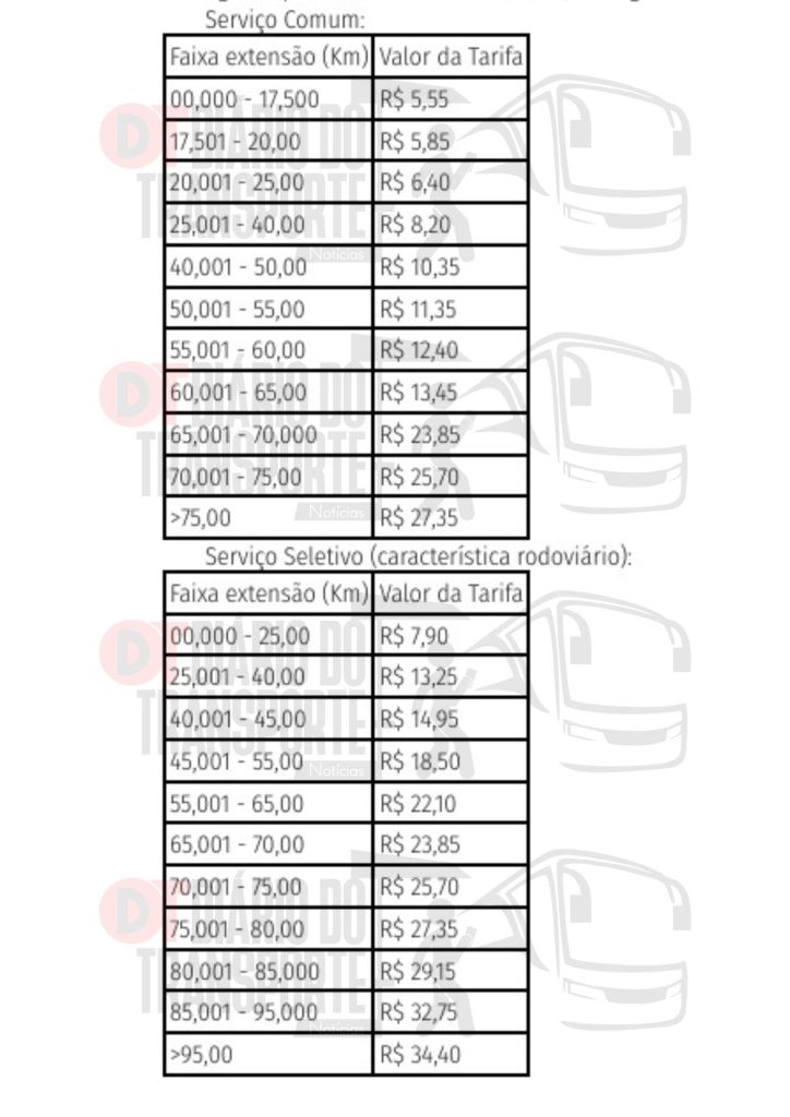 As comuns terão preços entre R$ 4,15 e R$ 12 e as seletivas entre R$ 9,05 e R$ 30,65, dependendo da extensão do trajeto e da área operacional.