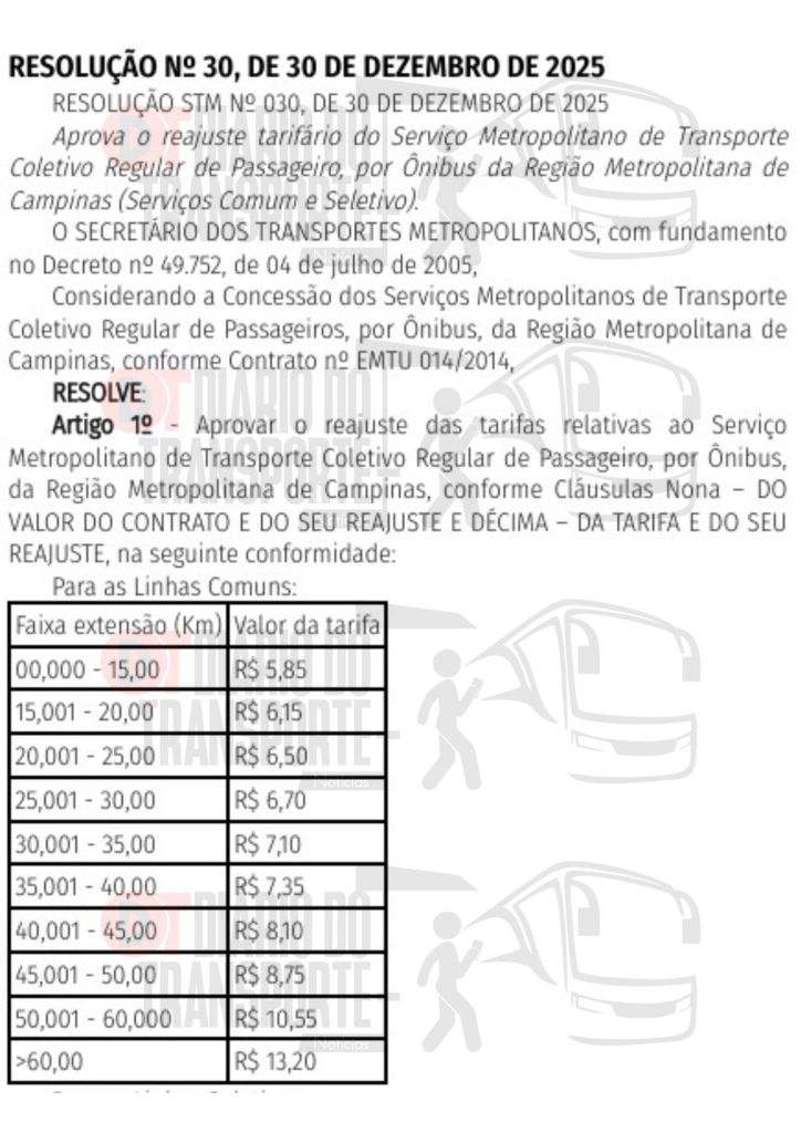 Na Região Metropolitana de Campinas, no interior de São Paulo, as tarifas de ônibus intermunicipais metropolitanos ficam, a partir de 06 de janeiro de 2026, entre R$ 5,85 e R$ 13,20 nas linhas comuns, e entre R$ 5,85 e R$ 24,90 nas linhas seletivas, dependendo da extensão dos trajetos.