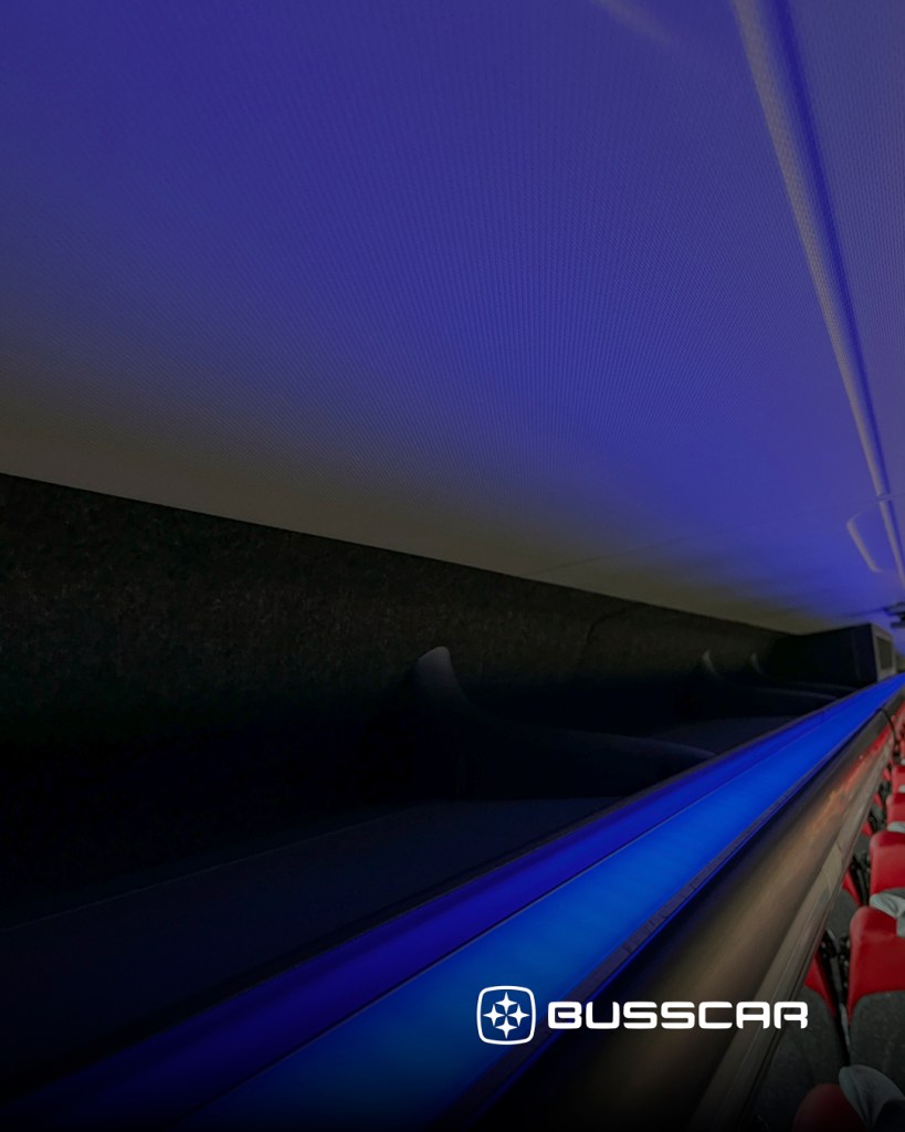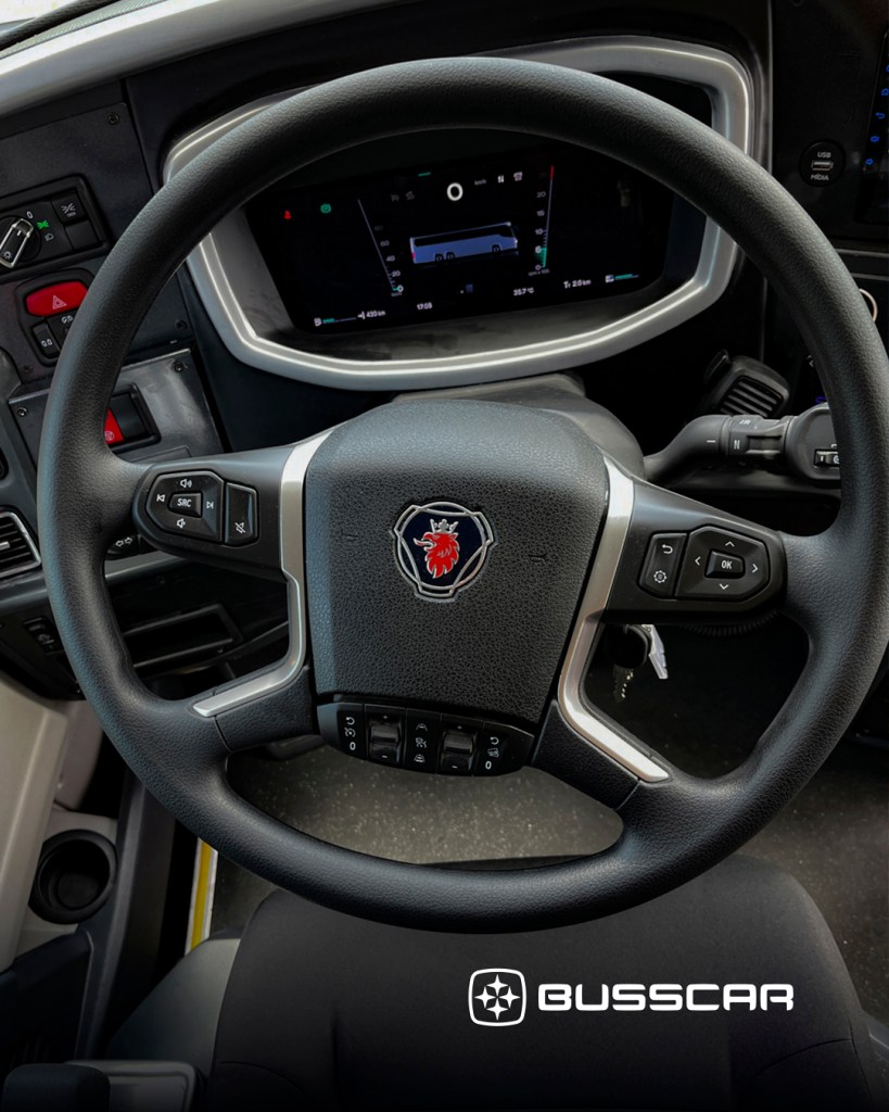 O sistema de comunicação e entretenimento inclui displays informativos nos dois salões com relógio, indicação de sanitário, alarme de velocidade e mensagens de segurança, central multimídia touchscreen, rádio adicional, monitores distribuídos, alto-falantes, interfone em três pontos, plugs para microfone e câmera de ré integrada, além de sensor de estacionamento com alertas sonoros e visuais. O veículo dispõe ainda de ampla infraestrutura elétrica, com tomadas USB-A, USB-C e conector 12V para motorista, tripulação e todas as poltronas, acompanhadas de suporte articulado para celular.