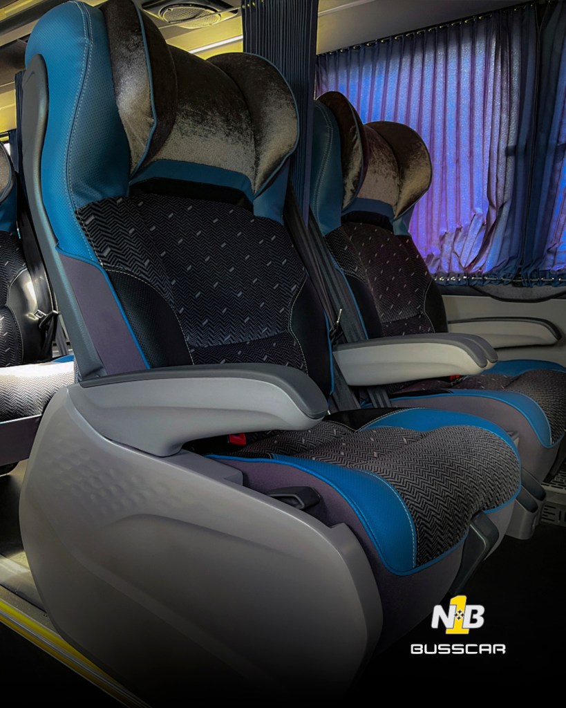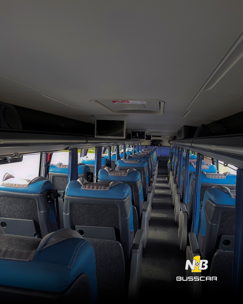 O Panorâmico DD NB1 oferece um ambiente interno amplo e cuidadosamente planejado, com capacidade total para 43 passageiros, sendo 31 no salão superior e 12 no salão inferior. Ambos os salões são equipados com poltronas Class Leito, com revestimentos selecionados pelo cliente, quatro posições de reclinação e espuma viscoelástica, assegurando elevado nível de conforto em viagens de longa duração. As poltronas contam ainda com apoios de braço escamoteáveis voltados para o corredor, ampliando o espaço individual, além de plataforma para pés e pernas, favorecendo uma postura mais ergonômica e uma experiência de viagem ainda mais confortável.
