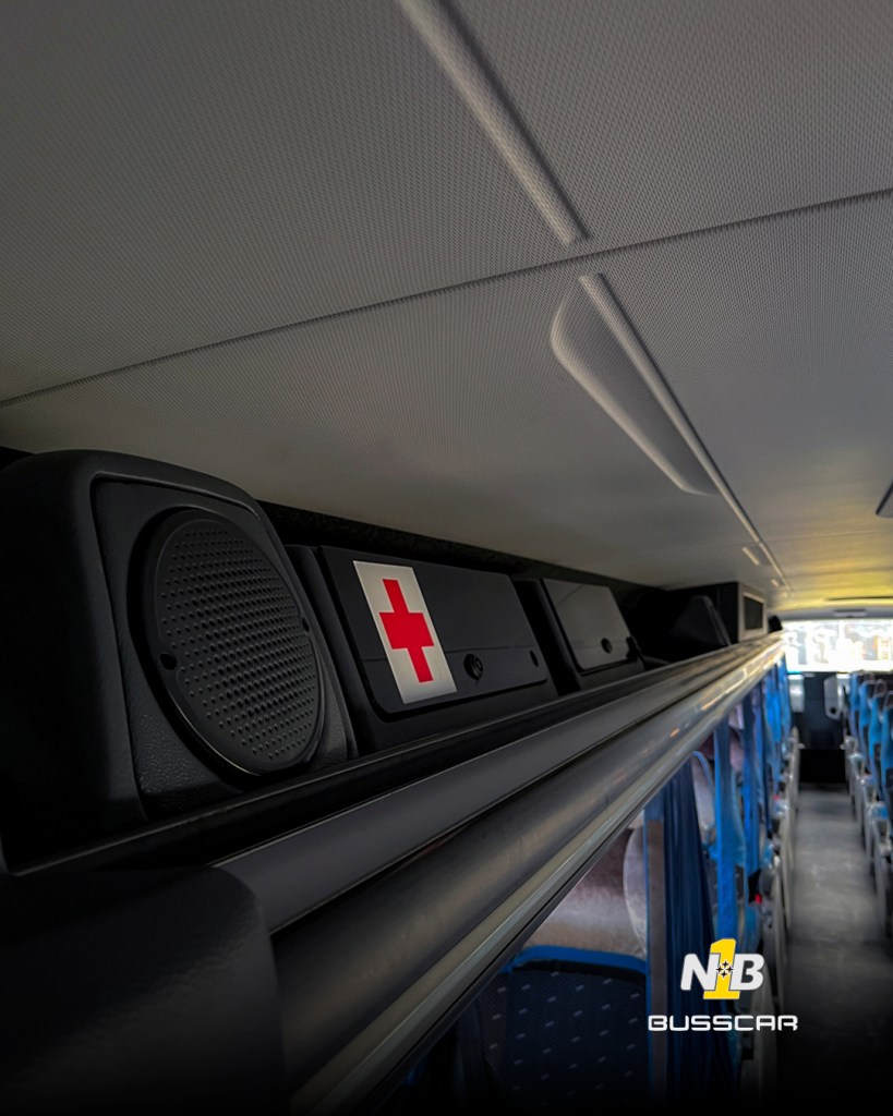 Além dos atributos de conforto e climatização, o modelo também se destaca pelos recursos voltados à segurança operacional e à condução. O Panorâmico DD NB1 conta com faróis auxiliares de longo alcance, estrategicamente posicionados entre os para-brisas superior e inferior, ampliando a visibilidade noturna e reforçando a segurança em viagens de longa distância. O veículo é equipado com dois espelhos retrovisores externos avançados, bipartidos, com sistema de desembaçamento e ajuste elétrico, assegurando melhor campo de visão ao motorista. Complementando o pacote de segurança, o bloqueador original do chassi impede o deslocamento do veículo com as portas abertas, enquanto um sistema adicional bloqueia a abertura das portas de serviço quando o ônibus está em movimento acima de 5 km/h.