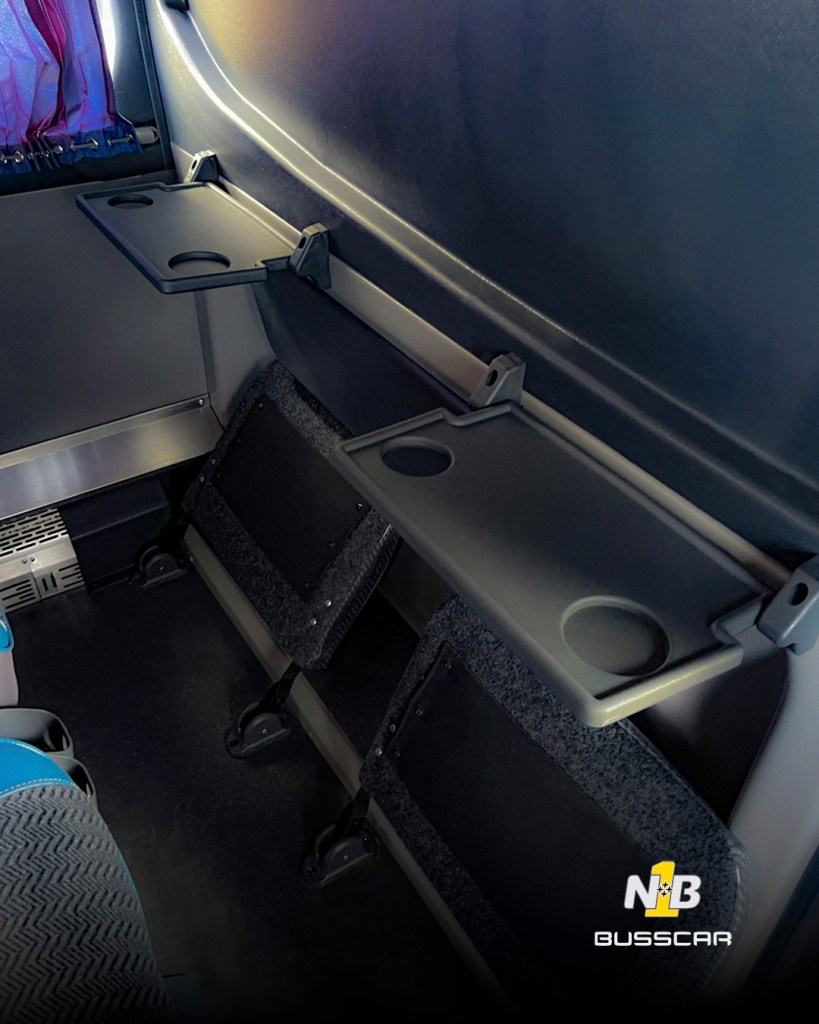 O conjunto é complementado por bandejas tipo ruspa instaladas atrás dos encostos das poltronas em ambos os salões, oferecendo maior praticidade ao passageiro para acomodação de objetos pessoais, alimentos e dispositivos eletrônicos durante a viagem. As poltronas também são equipadas com cintos de segurança retráteis de três pontos, reforçando o cuidado com funcionalidade, conforto e segurança a bordo.