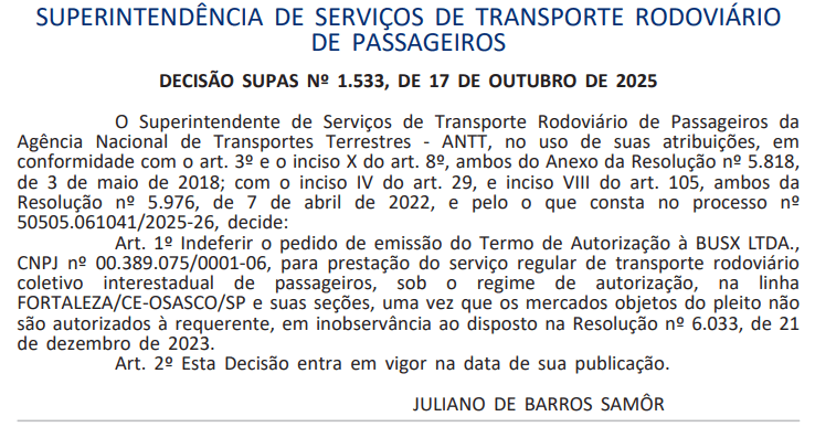 Com o indeferimento, a BusX segue impedida de operar a linha e suas seções, permanecendo sem autorização para o serviço regular interestadual de passageiros. O ato foi assinado pelo superintendente Juliano de Barros Samôr e publicado no Diário Oficial da União desta sexta-feira, 24 de outubro de 2025.