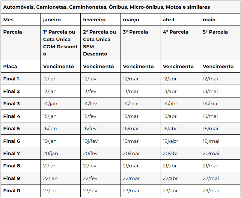 Pagamento seguirá final da placa do veículo e pode ser feito à vista, com desconto de 3%, ou parcelado em até 5 vezes, de acordo com o valor do imposto devido