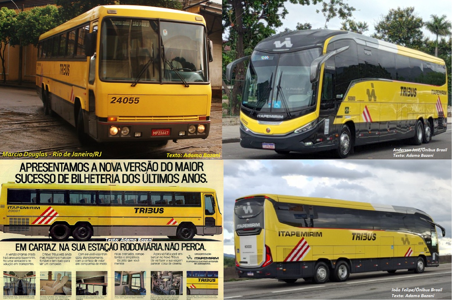 Da esquerda para a direita e de cima para baixo: Ônibus Marcopolo G8 – 1350 prefixo 60.000 em homenagem ao TRIBUS; Ônibus Marcopolo G8 – 1350 com pintura atual da Itapemirim; Ônibus Marcopolo G7 – 1200 prefixo 70.000 com pintura em homenagem aos 70 anos da Itapemirim; Ônibus de dois andares Leito-Cama com a pintura atual da Itapemiriim