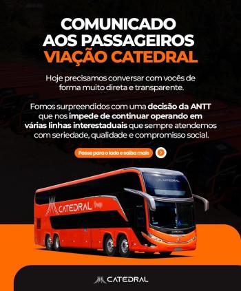 A Viação Catedral se manifestou publicamente nesta terça-feira (4) sobre a decisão da Agência Nacional de Transportes Terrestres (ANTT) que cassou 27 autorizações de linhas interestaduais operadas pela empresa, após constatar fraudes em dados operacionais informados ao sistema MONITRIIP.