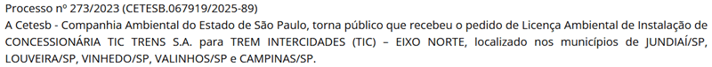 A Companhia Ambiental do Estado de São Paulo (Cetesb) tornou público que recebeu o pedido de Licença Ambiental de Instalação (LAI) da concessionária TIC Trens, responsável pela implantação do projeto Trem Intercidades (TIC) – Eixo Norte, que ligará Campinas à capital paulista via Jundiaí.