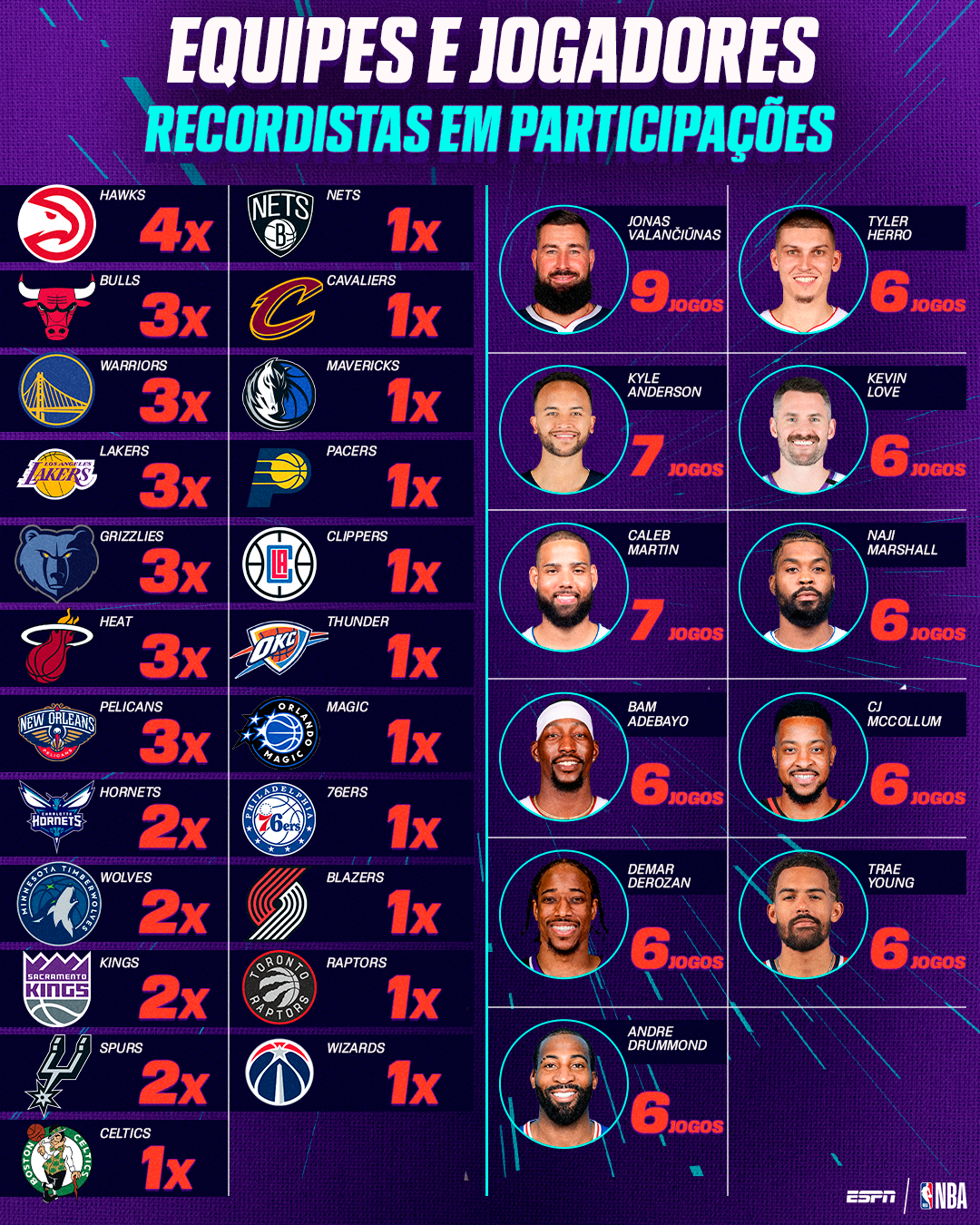 Três dos líderes, porém, subirão suas posições no ranking. Pelo Heat, Bam Adebayo e Tyler Herro podem chegar a oito partidas no play-in nesta temporada. Herro também pode se tornar o maior pontuador em jogos de play-in na história. O ala tem 155 pontos e está em segundo na lista, atrás apenas de Trae Young, com 166, que não jogará este ano. E nos 76ers, Andre Drummond também terá a possibilidade de alcançar o oitavo jogo.
