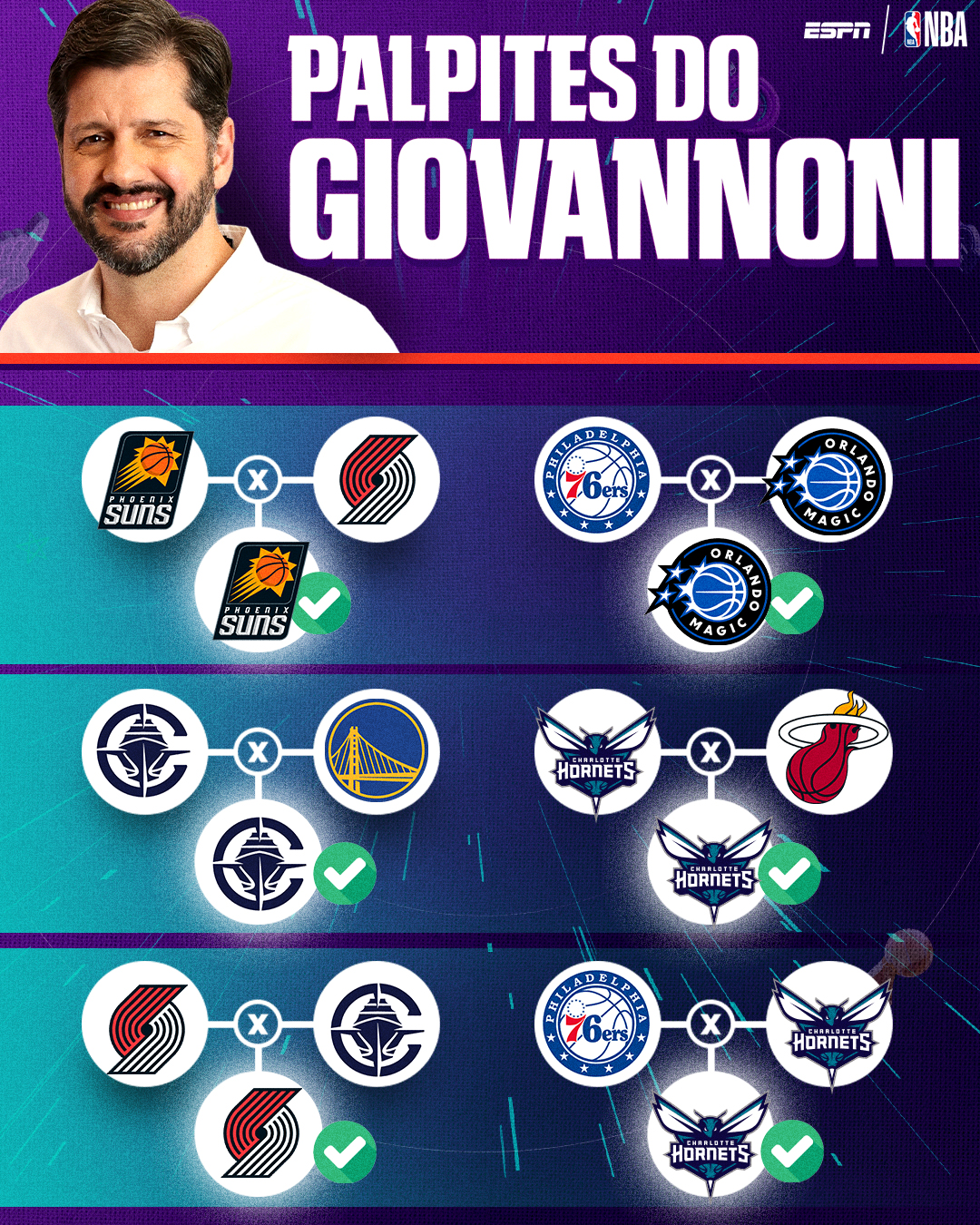 O comentarista dos canais Disney, Guilherme Giovannoni, não ficou em cima do muro ao opinar sobre os prováveis vencedores de cada um dos seis duelos do play-in. Para ele, o Magic vai fazer valer o fator casa e garantir a 7ª vaga no Leste. Mesmo com uma derrota surpreendente na última rodada, a franquia de Orlando deve vencer os 76ers, desfalcados de Embiid. E a 8ª vaga deve ficar com o Charlotte Hornets, que vivem um grande momento nos últimos meses, despachando Philadelphia.