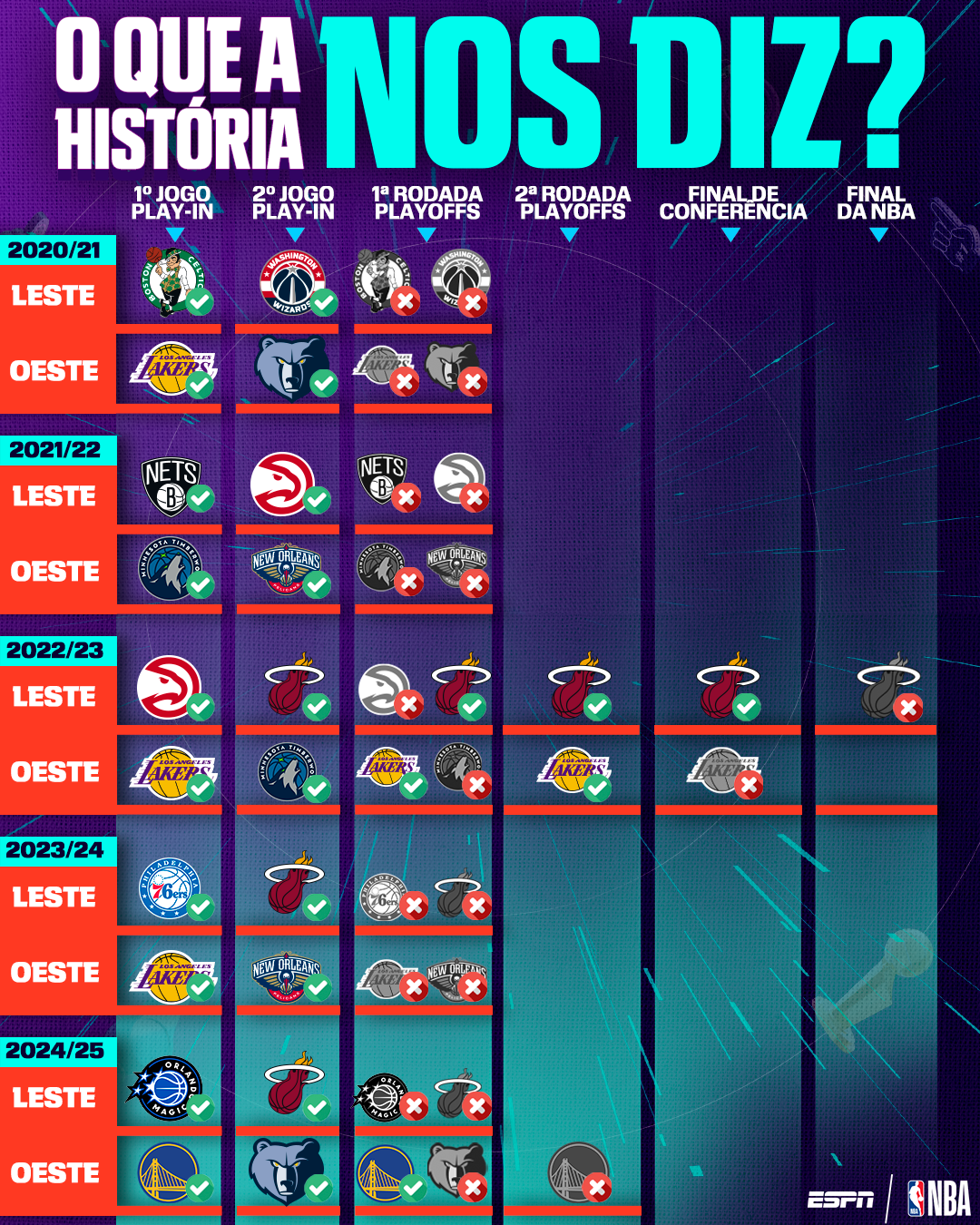 Já em 2020-21, a NBA instituiu o play-in da maneira como conhecemos hoje: confrontos do 7° contra o 8° e do 9° contra o 10° em cada conferência. Ainda sob muita reclamação, principalmente pela diferença de nove vitórias do 10° colocado, San Antonio Spurs, para o 8°, Golden State Warriors, na Conferência Oeste, a edição já teve a primeira ‘zebra’, com a classificação do Memphis Grizzlies, que havia terminado a temporada em 9°.