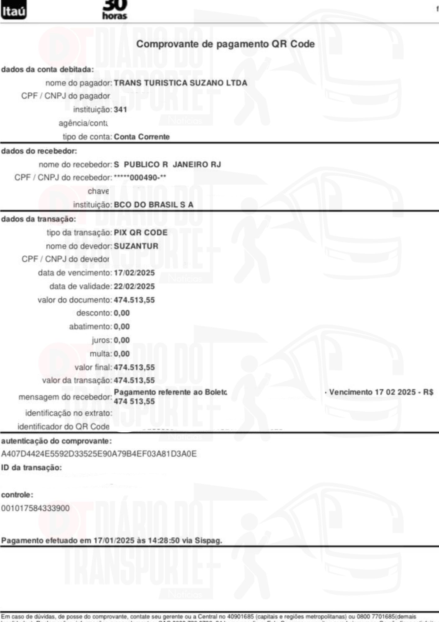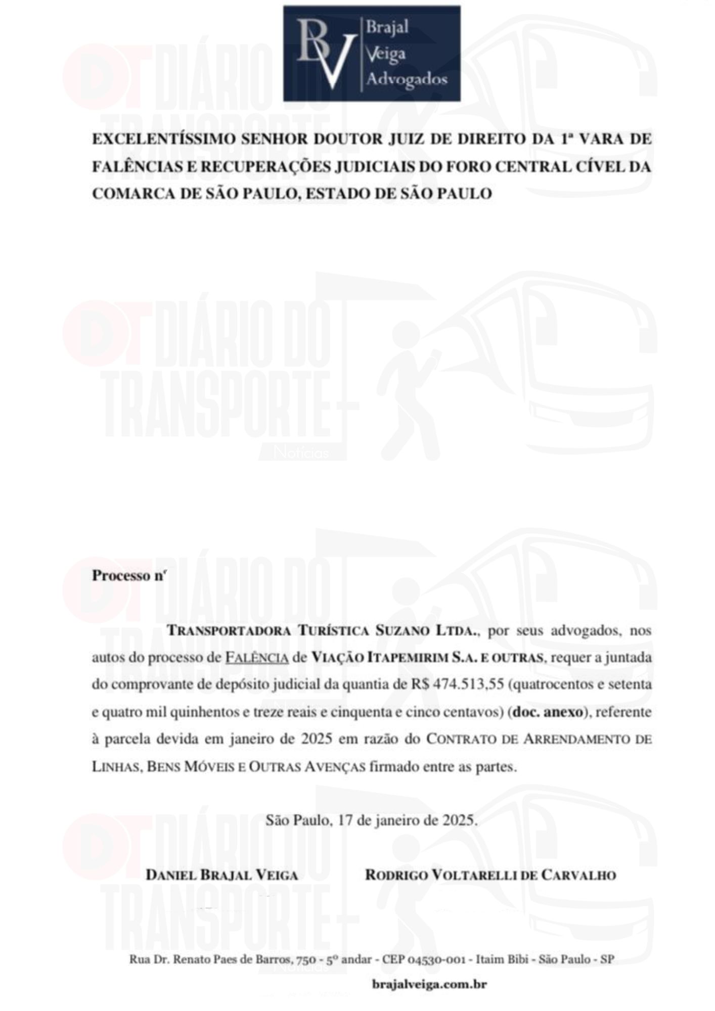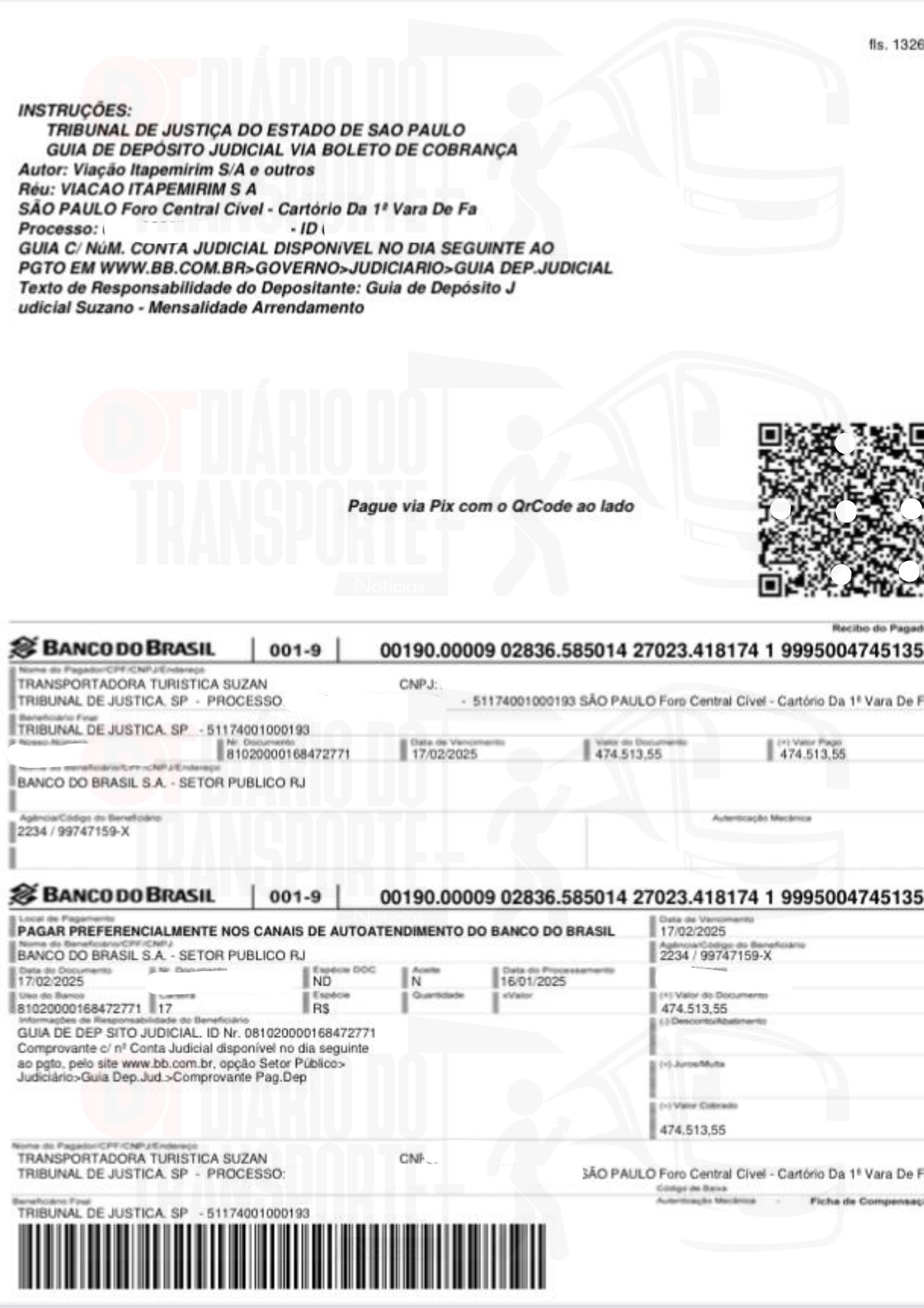 A Suzantur (Transportadora Turística Suzano Ltda) pagou em 17 de janeiro de 2025 quase R$ 500 mil (R$ 474.513,55) pelo arrendamento de linhas e estruturas que eram de responsabilidade das empresas viações Itapemirim e Kaissara, que faliram.