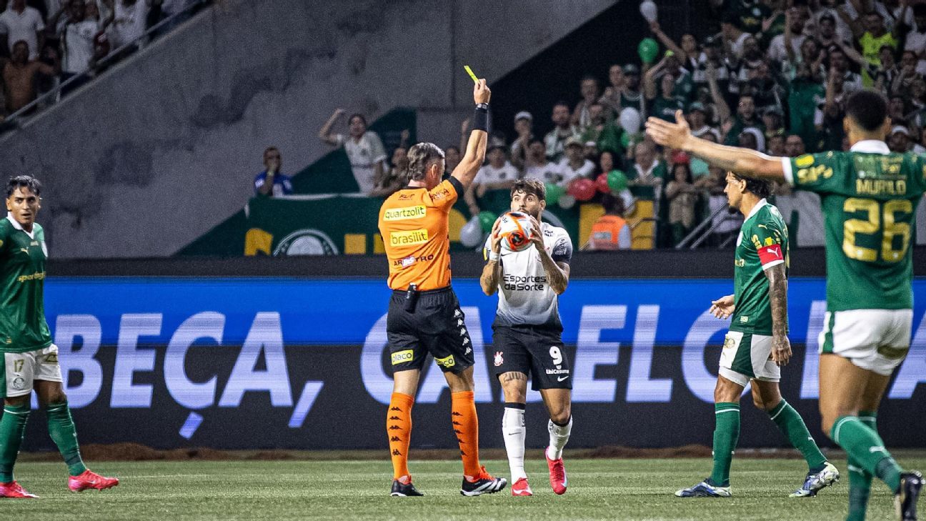 O camisa 9 do Timão já tinha recebido o cartão amarelo ao comemorar o gol com uma voadora na bandeira de escanteio, que tinha uma flâmula do Palmeiras. Por isso, a simulação errada fez o árbitro Raphael Claus decidir pela expulsão aos 17 minutos do segundo tempo.