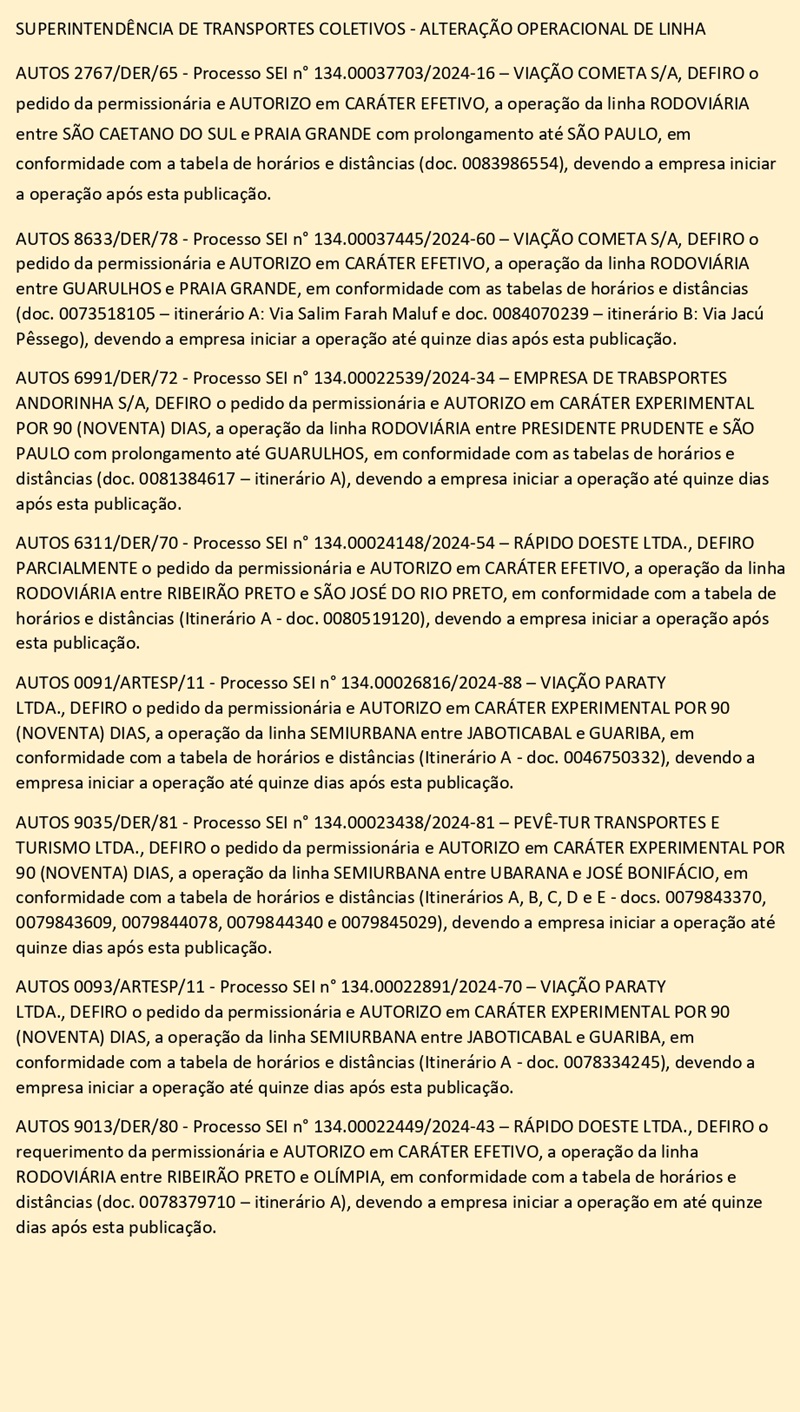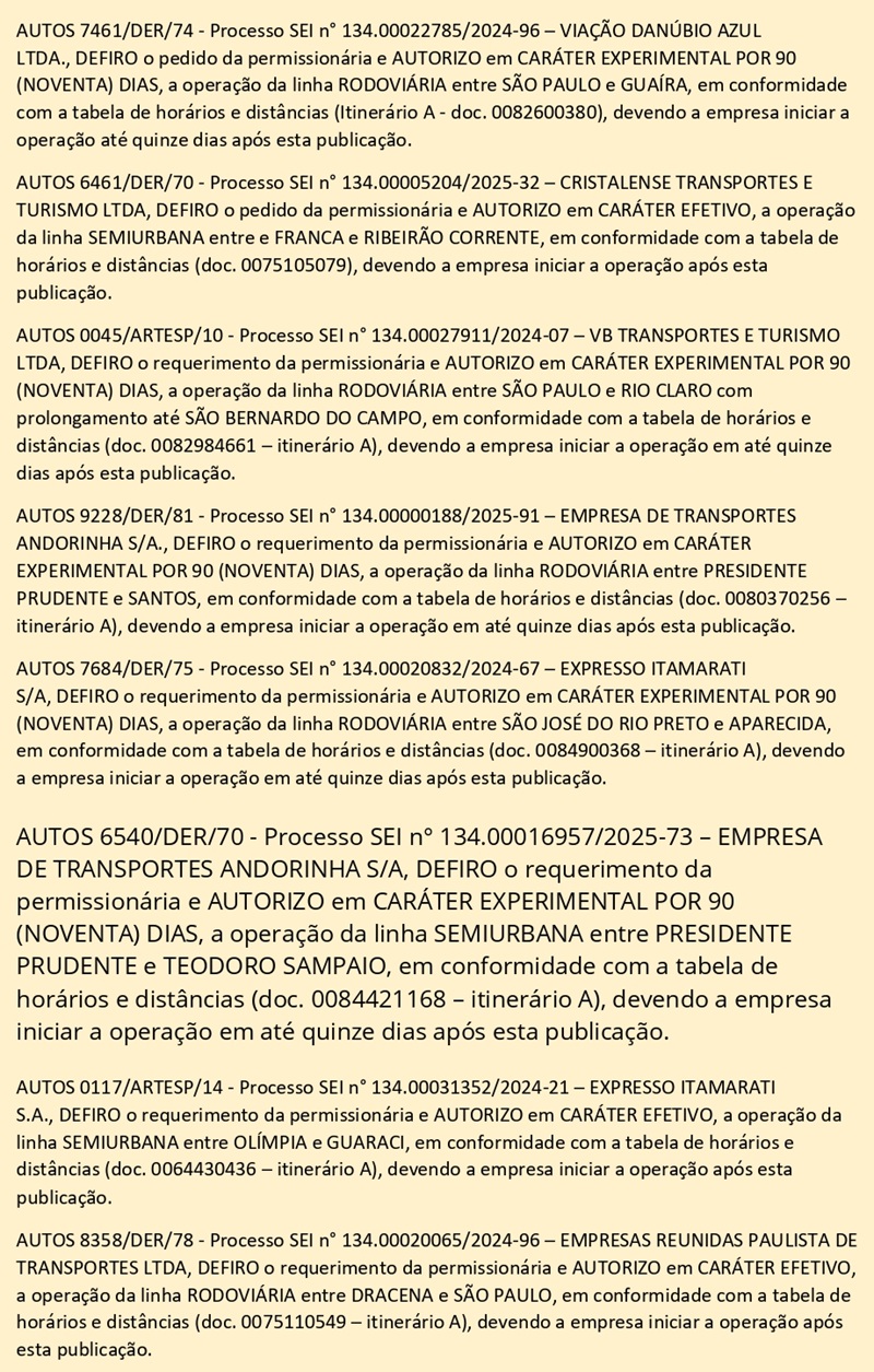 Também foram publicadas autorizações envolvendo a Rápido D’Oeste (Ribeirão Preto–São José do Rio Preto e Ribeirão Preto–Olímpia), a VB Transportes e Turismo (São Paulo–Rio Claro com prolongamento até São Bernardo do Campo), a Viação Paraty (Jaboticabal–Guariba), a Cristalense Transportes (Franca–Ribeirão Corrente) e a Pevê-Tur (Ubarana–José Bonifácio).