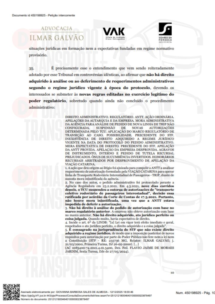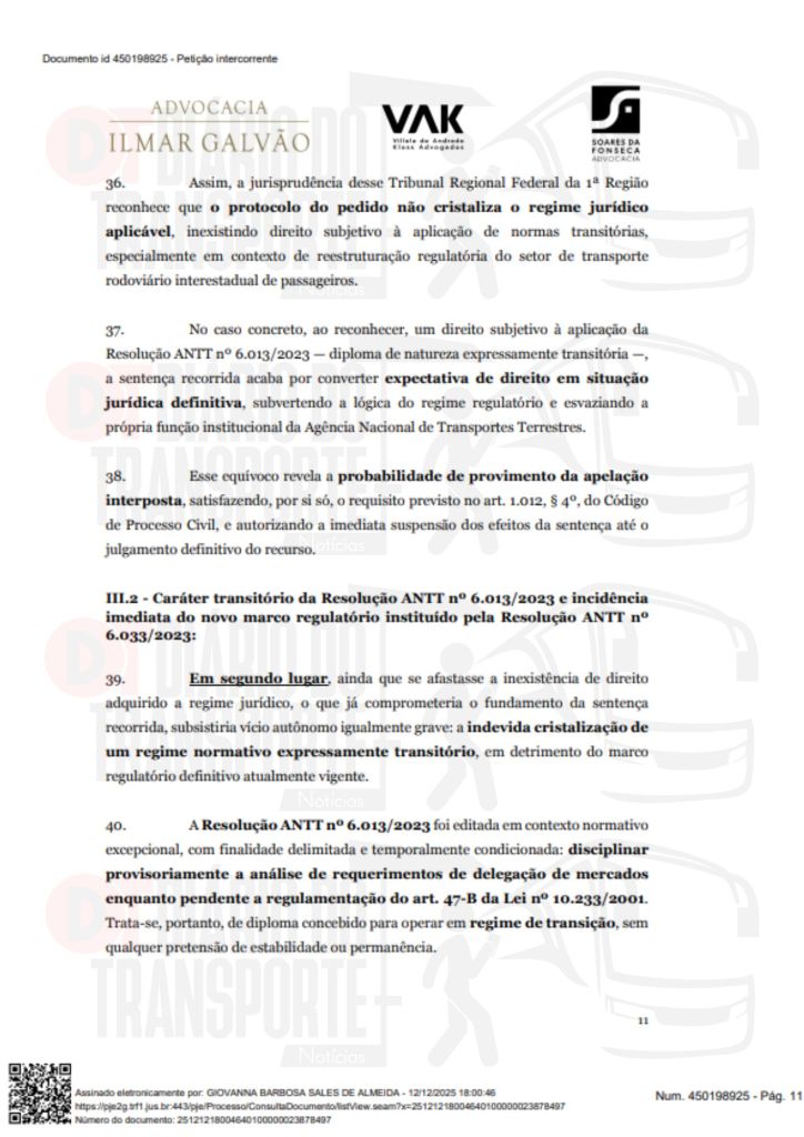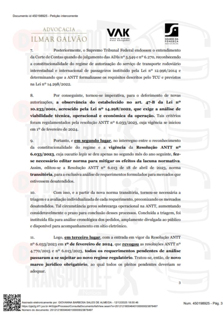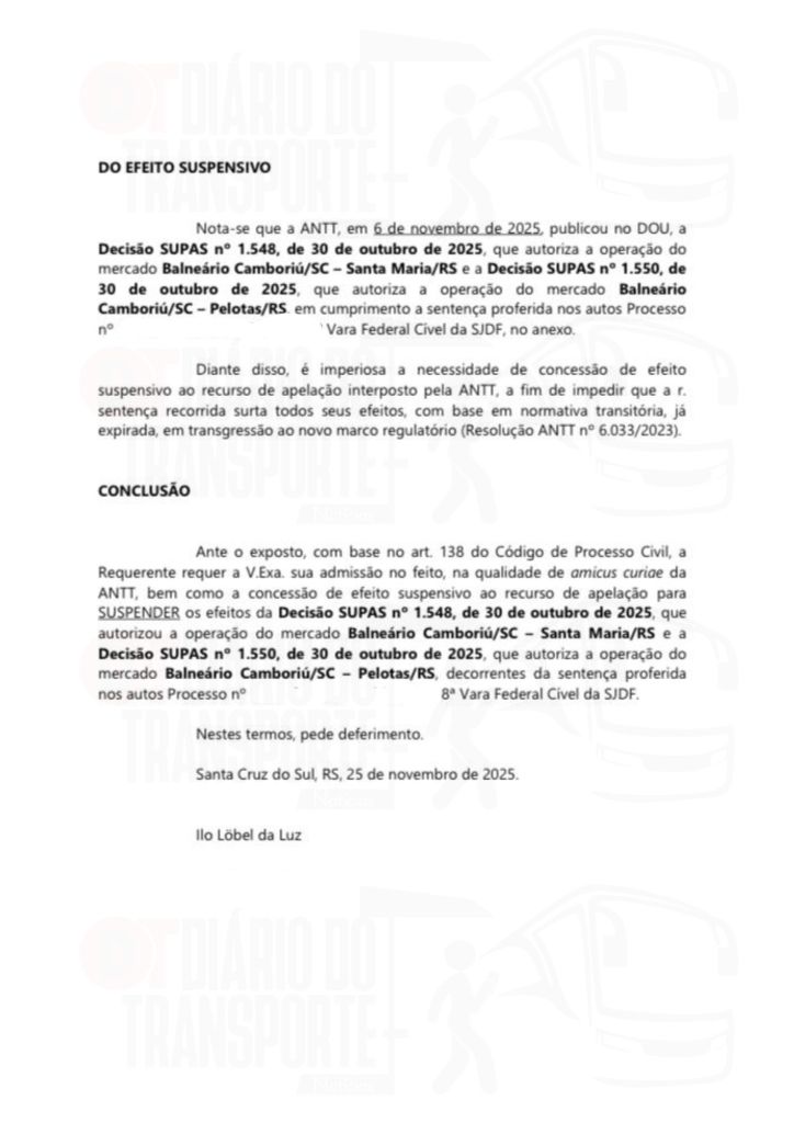 As empresas também argumentam que o cumprimento automático de decisões judiciais, sem a devida adequação às normas atualmente em vigor, compromete a coerência do modelo regulatório e a segurança jurídica do setor de transporte interestadual de passageiros.