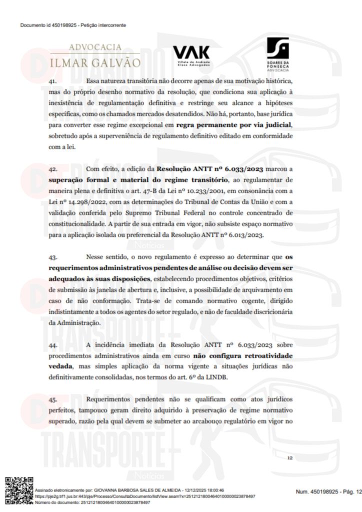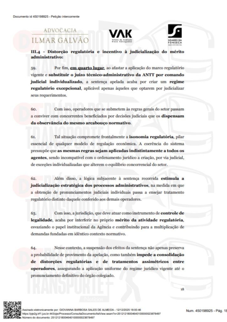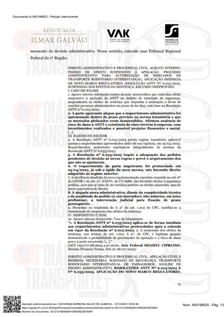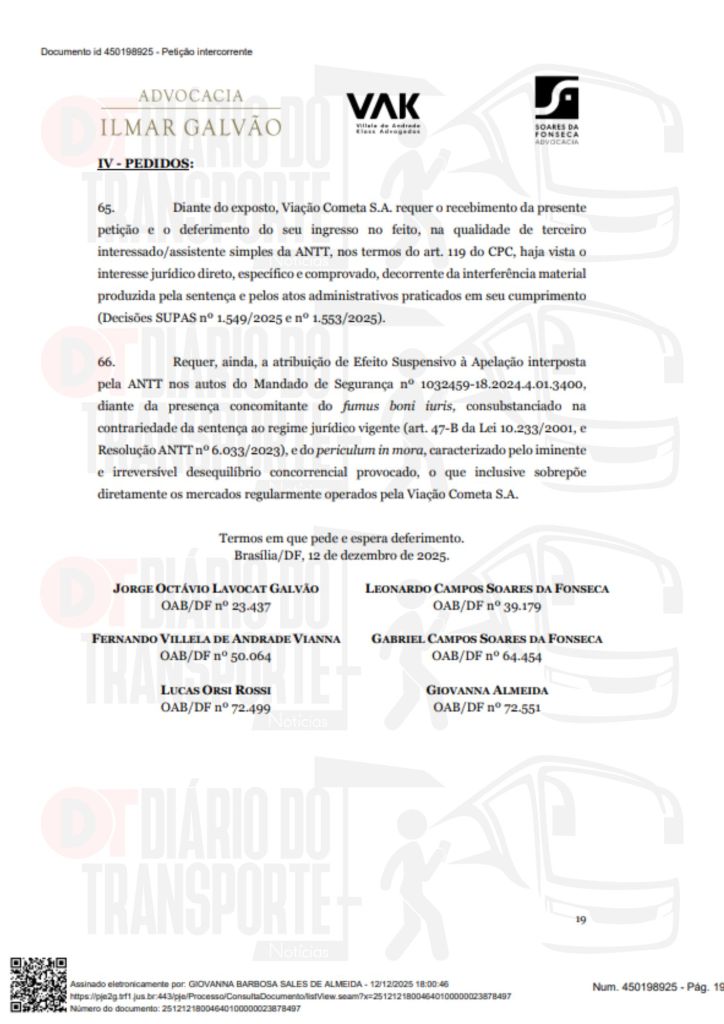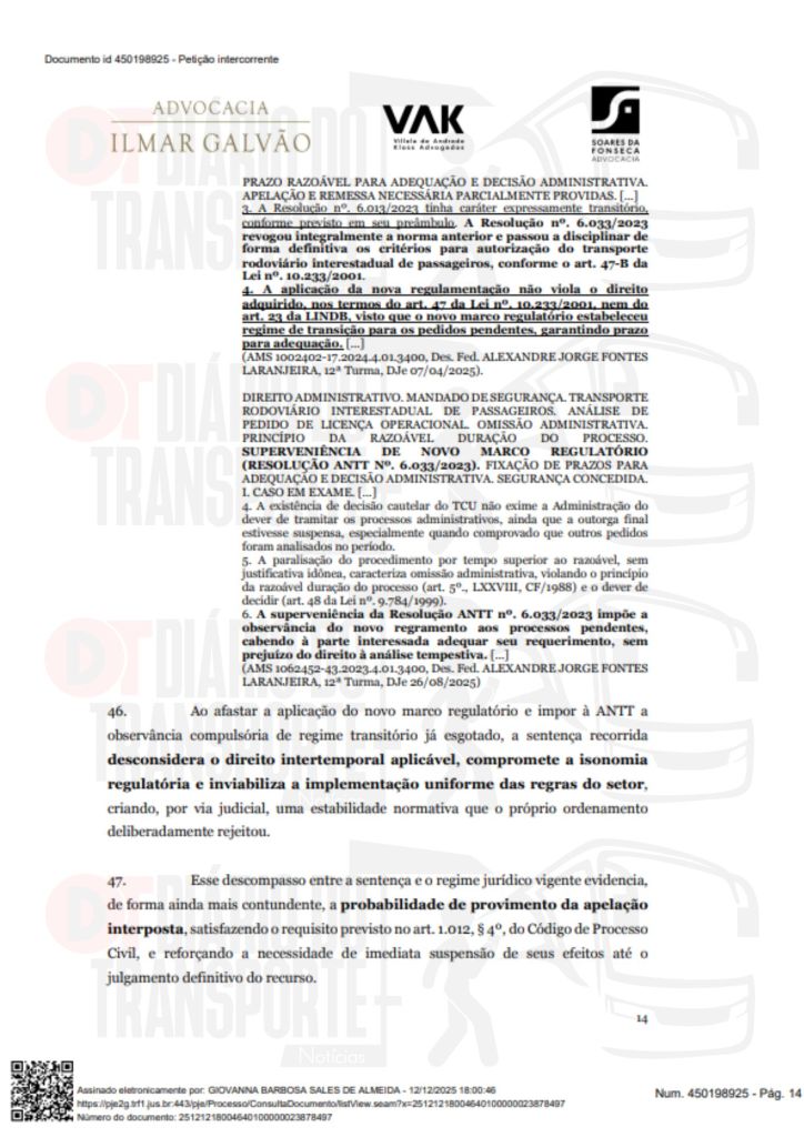 As empresas também argumentam que o cumprimento automático de decisões judiciais, sem a devida adequação às normas atualmente em vigor, compromete a coerência do modelo regulatório e a segurança jurídica do setor de transporte interestadual de passageiros.