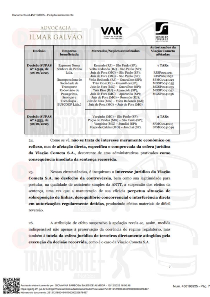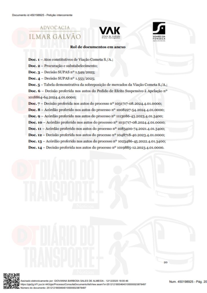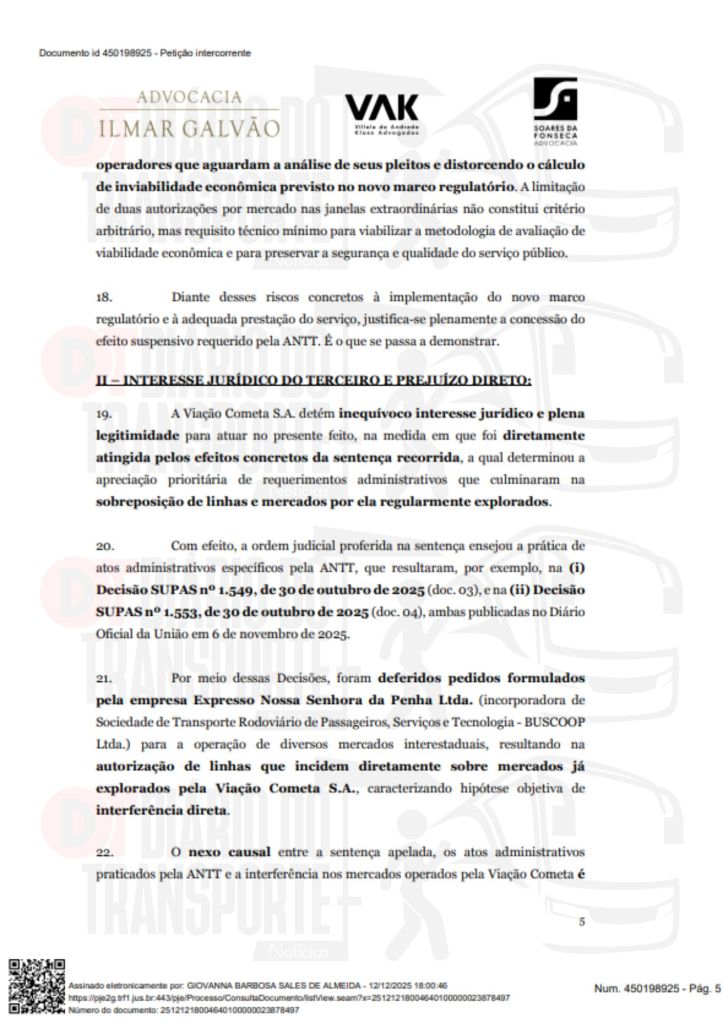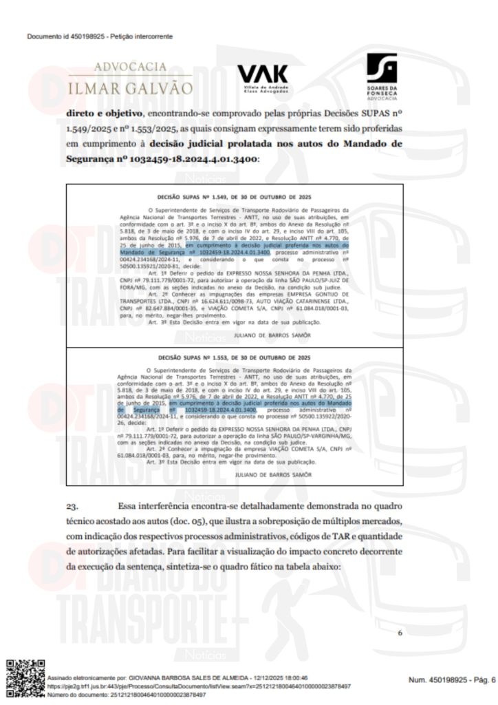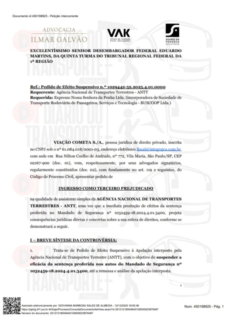 As contestações foram apresentadas no âmbito de pedido de efeito suspensivo à apelação em tramitação no Tribunal Regional Federal da 1ª Região (TRF-1) e atingem diretamente decisões da SUPAS publicadas no Diário Oficial da União em novembro deste ano, que autorizaram a Penha a iniciar a operação de diversas linhas interestaduais enquanto o mérito judicial ainda está em discussão.