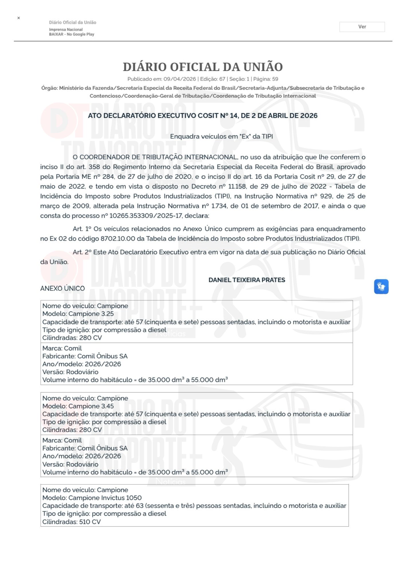 A publicação oficial ocorreu nesta quinta-feira (09) em ato declaratório da Secretaria Especial da Receita Federal do Brasil, do Ministério da Fazenda, e o criador e editor-chefe do Diário do Transporte, Adamo Bazani, traz em primeira-mão.