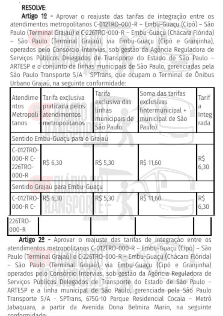 No Terminal Grajaú, sobem para R$ 6,30 as tarifas integradas entre a SPTrans, da capital paulista; e as linhas metropolitanas 12 – Embu-Guaçu (Cipó) – São Paulo (Terminal Grajaú) e– Embu-Guaçu (Chácara Flórida) – São Paulo (Terminal Grajaú), via Embu-Guaçu (Cipó e Granjinha), operadas pelo Consórcio Intervias