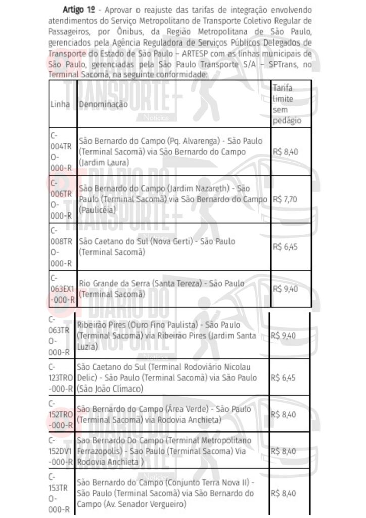 As passagens de ônibus intermunicipais do ABC que se integram com o Expresso Tiradentes no Terminal Sacomã também ficam mais caras a partir de 06 de janeiro de 2026 e ficam entre R$ 6,45; R$ 7,10; R$ 7,70; R$ 9,20 e R$ 9,40, dependendo da linha