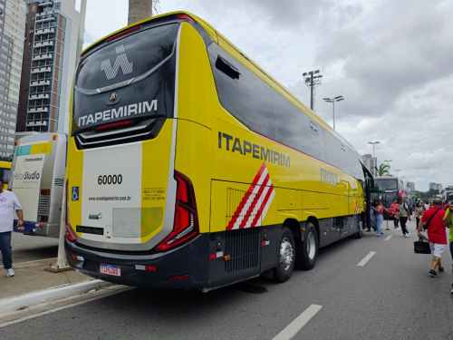 Um dos destaques mais modernos da exposição, o Paradiso G8 1200 montado sobre chassi Mercedes-Benz O-500RSD representa a aposta da Nova Itapemirim na renovação de frota. Esse modelo rodoviário de alto padrão enfatiza conforto e tecnologia para viagens intermunicipais, reforçando a presença oficial da empresa no evento.