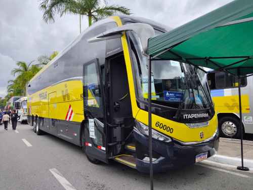 Um dos destaques mais modernos da exposição, o Paradiso G8 1200 montado sobre chassi Mercedes-Benz O-500RSD representa a aposta da Nova Itapemirim na renovação de frota. Esse modelo rodoviário de alto padrão enfatiza conforto e tecnologia para viagens intermunicipais, reforçando a presença oficial da empresa no evento.