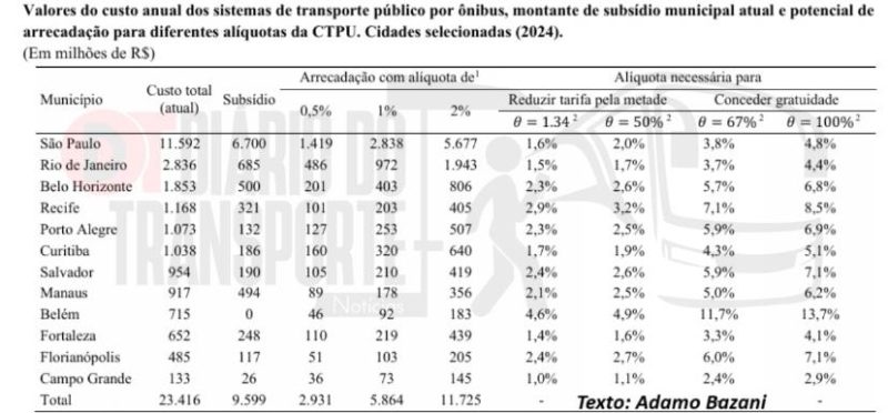 De acordo com as simulações com base nos dados eSocial (2024), informações sobre custos operacionais e subsídios municipais de doze capitais brasileiras, o Ipea, em uma nota técnica apontou que se essa Contribuição Social para o Transporte Público Urbano (CTPU) tivesse uma alíquota entre 0,5% e 1% seria suficiente para dobrar o nível atual de subsídio aos sistemas de ônibus.