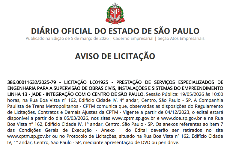 A Companhia Paulista de Trens Metropolitanos (CPTM) abriu licitação para contratar serviços especializados de engenharia destinados à supervisão das obras do empreendimento Linha 13-Jade – Integração com o Centro de São Paulo.